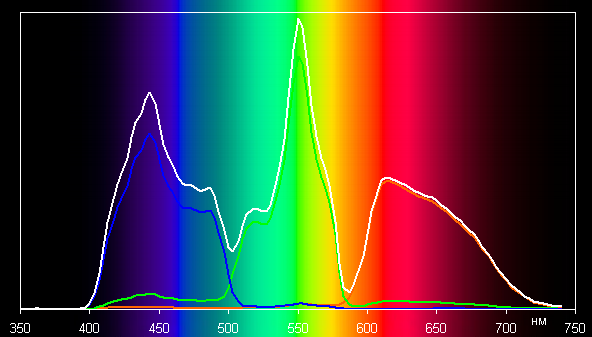 Видно, что компоненты хорошо разделены и при выборе профиля D. Cinema разделение дополнительно увеличивается с помощью оптического фильтра (об этом свидетельствует изменение спектров компонент и жужжание, раздающееся из проектора при выборе этого профиля). За счет такого разделения компонент достигается широкий цветовой охват, что и нужно для вывода в режиме HDR. Отметим, что в целом это типичные спектры для проекторов с источником света в виде ртутной лампы высокого давления.