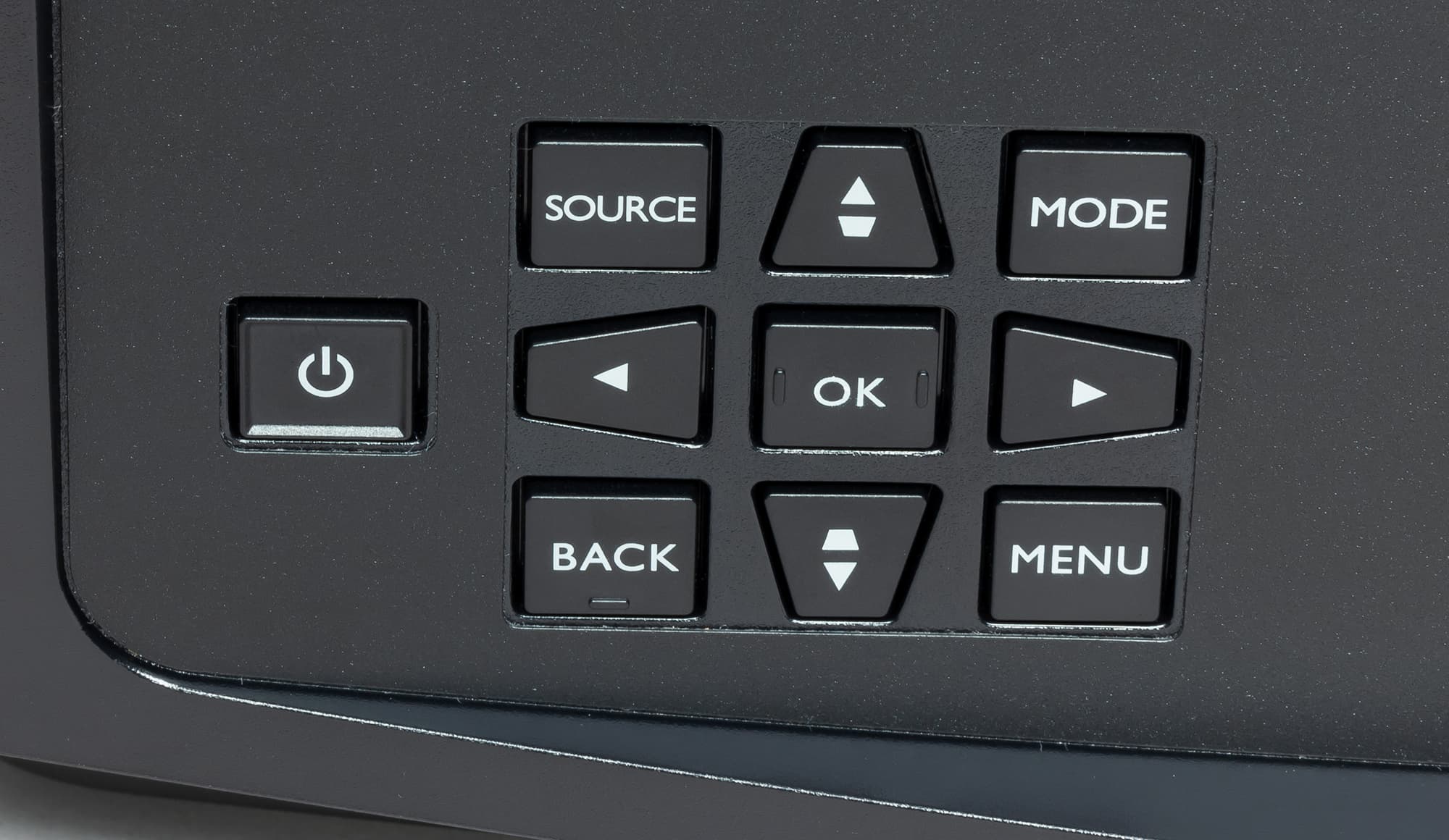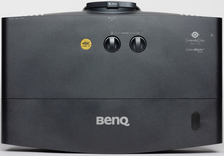 Кнопки изготовлены из твердого пластика и при нажатии негромко щелкают. Часть верхней панели снимается, открывая доступ к отсеку лампы. Для замены лампы проектор не нужно демонтировать с потолочного кронштейна. На верхней панели ближе к задней части есть окошко ИК-приемника, а ближе к объективу — воротки сдвига.