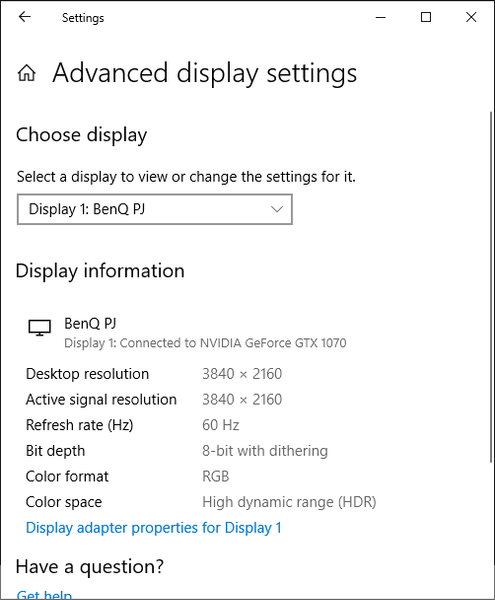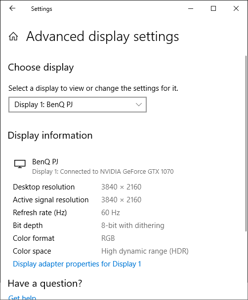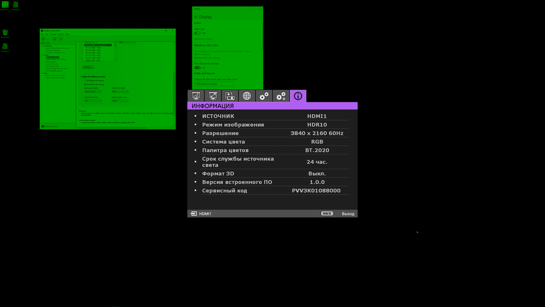 Под Windows 10 вывод в режиме HDR на данный проектор возможен при выборе соответствующих опций в настройках дисплея. При разрешении 4К и 60 Гц вывод идет в режиме 8 бит на цвет, дополненных динамическим смешением цветов, видимо, с помощью видеокарты на аппаратном уровне. При 30 Гц — 12 бит на цвет.
