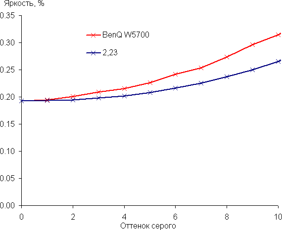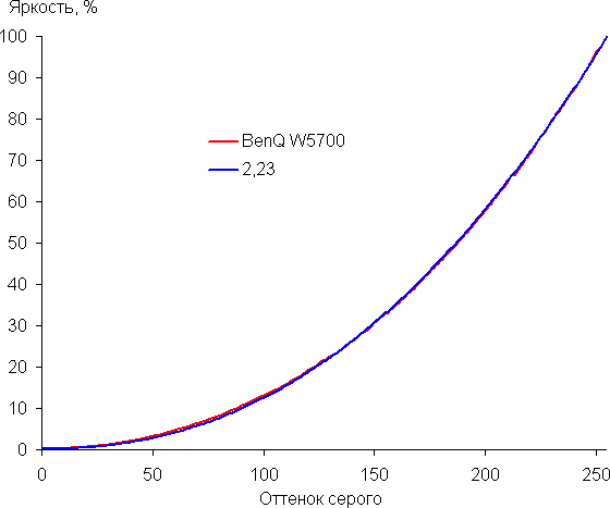 Реальная гамма-кривая аппроксимируется степенной функцией с показателем 2,23, что близко к стандартному значению 2,2, при этом аппроксимирующая функция близка к реальной гамма-кривой: