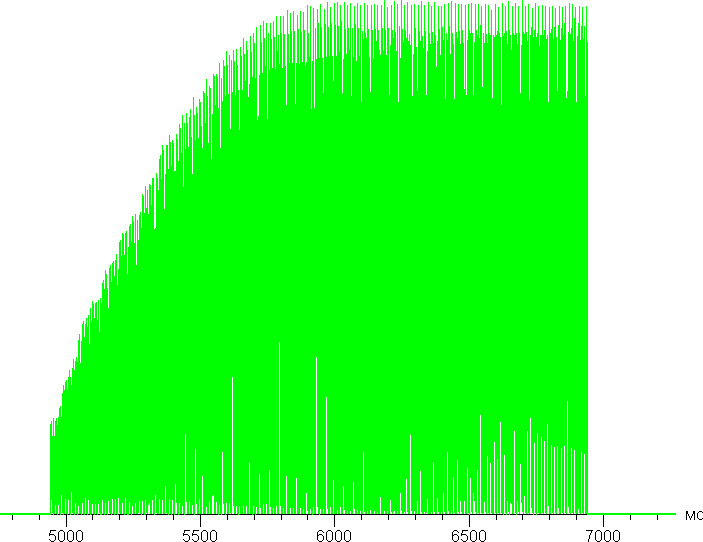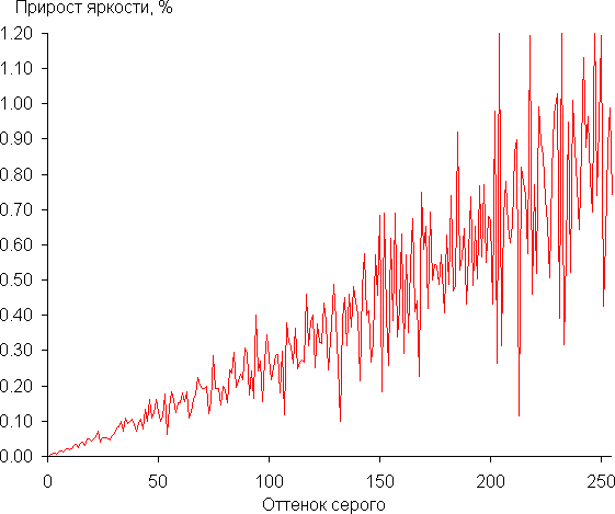 График ниже показывает прирост (не абсолютное значение!) яркости между соседними полутонами, полученный при последовательном выводе 256 оттенков серого (от 0, 0, 0 до 255, 255, 255) в случае оптимального сочетания параметров (Выбор гаммы = 2.3, Яркость = 54, Контрастность = 50):