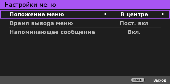 Можно выбрать положение меню на экране и задержку автоматического выходя из меню.