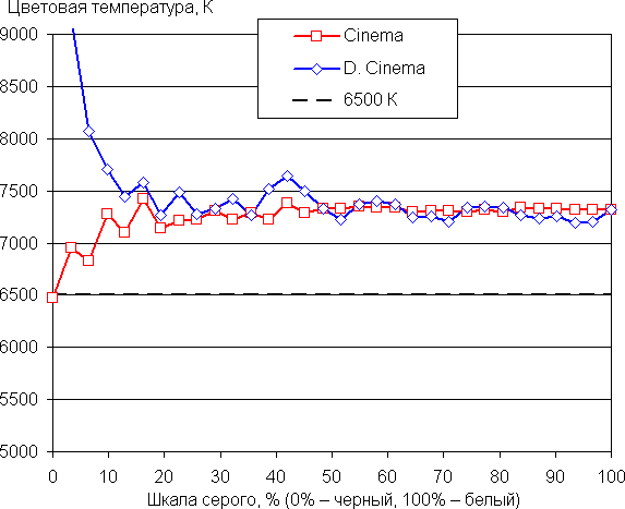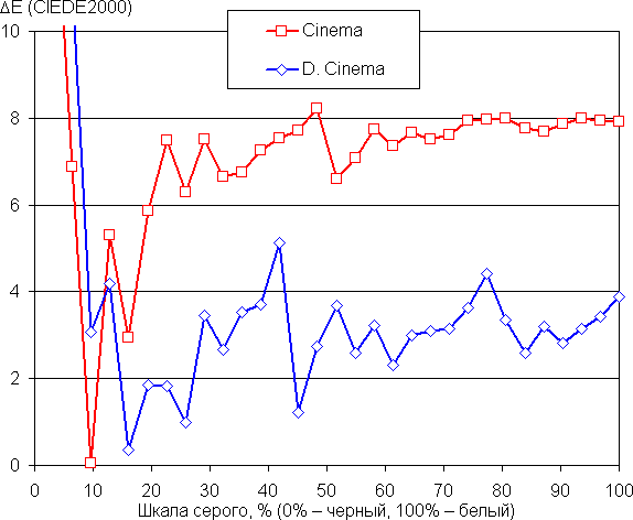 Графики ниже показывают цветовую температуру на различных участках шкалы серого и отклонение от спектра абсолютно черного тела (параметр ΔE) для режимов Cinema и D. Cinema, которые производитель считает оптимальными для просмотра фильмов со стандартным и расширенным цветовым охватом, соответственно. Укажем, что близкий к черному диапазон можно не учитывать, так как в нем цветопередача не так важна, а погрешность измерения цветовых характеристик высокая.