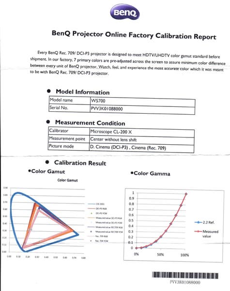 Отметим, что для каждого проектора выполняется заводская калибровка, о чем свидетельствует прилагаемый отчет: