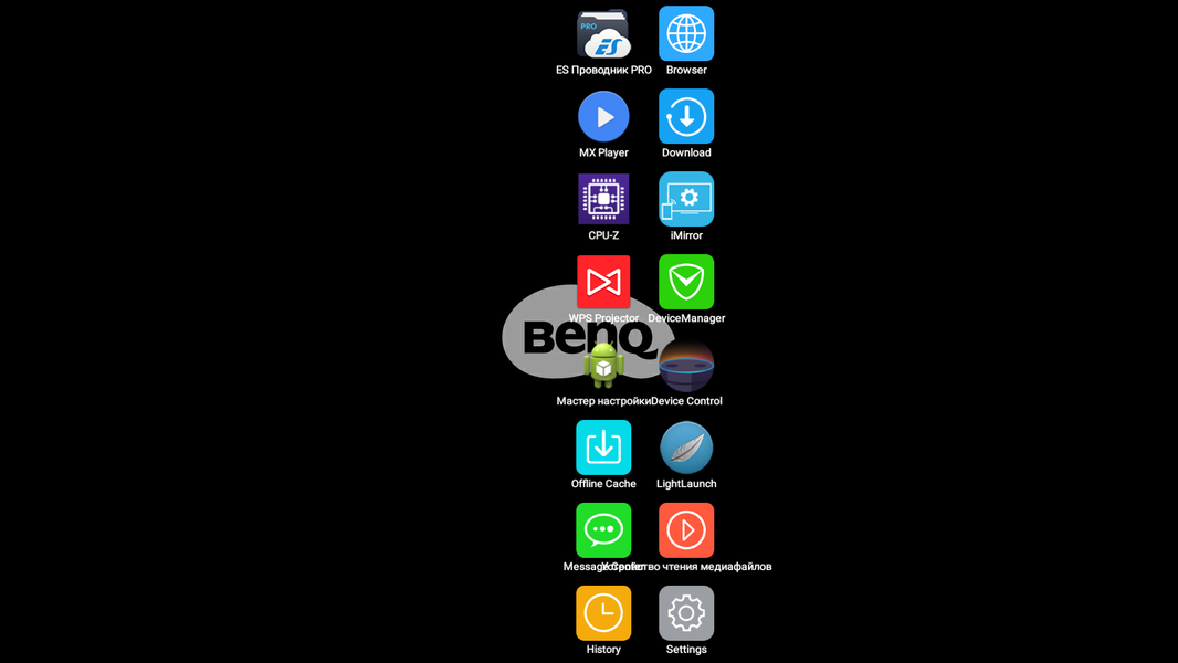 После этого при запуске проектора или при нажатии сочетания [Alt+Esc] на экран выводится стартовая страница, откуда можно запустить нужное приложение. Ниже — пример в случае LightLaunch (первый попавшийся из самых компактных лаунчеров) и трех установленных программ (ES Проводник Pro, MX Player и CPU-Z). Остальное — предустановленные программы, не представляющие никакого интереса.