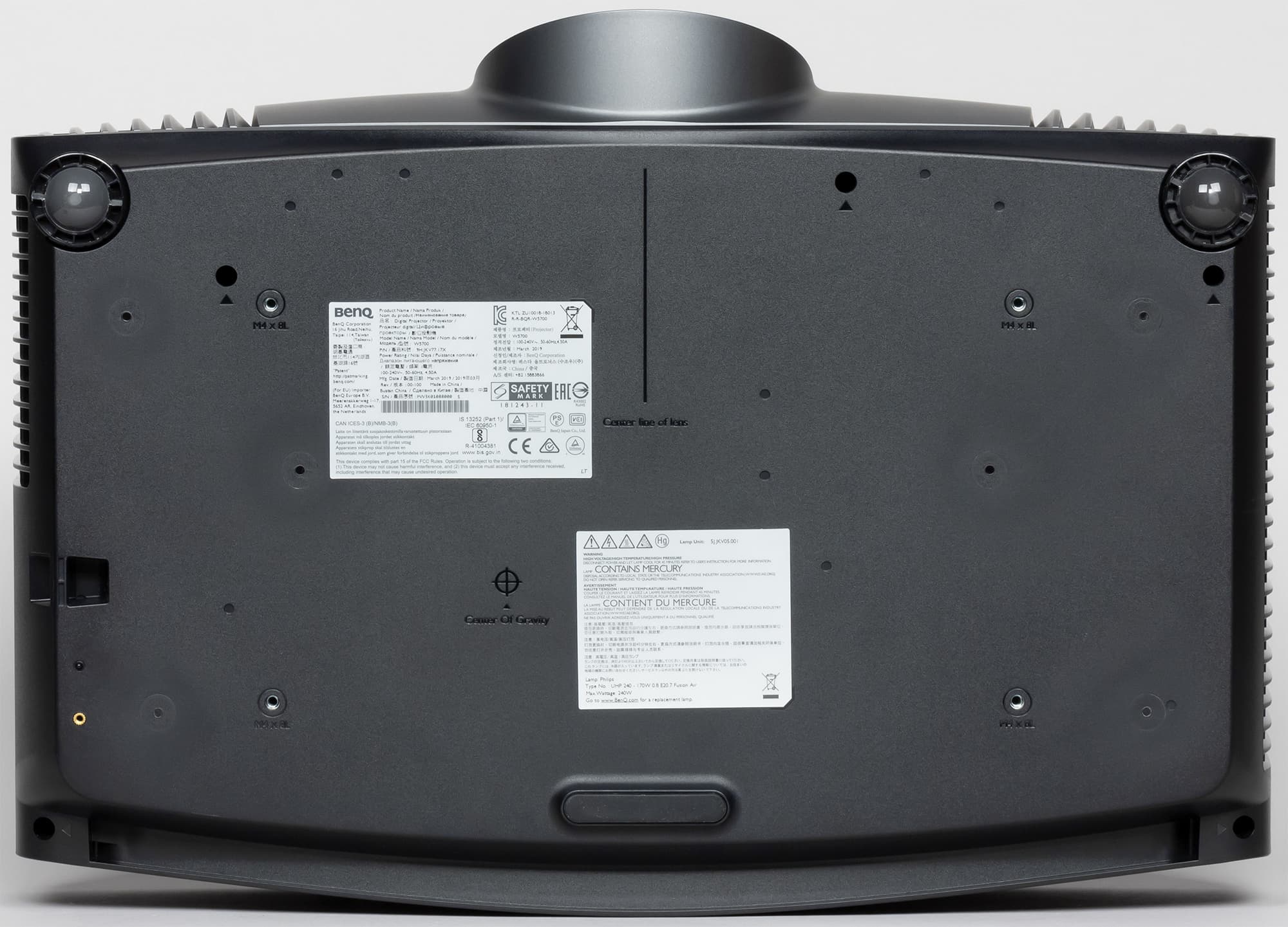 Проектор оснащен двумя передними вывинчивающимися из корпуса ножками (примерно на 24 мм, стальная стойка и металлическая втулка с резьбой, закругленные подошвы из упругого пластика), позволяющими устранить небольшой перекос и/или немного приподнять переднюю часть проектора при его размещении на горизонтальной поверхности, а сзади проектор опирается на ножку с широкой резиновой подошвой. Для крепления к потолочному кронштейну в днище проектора вделаны 4 стальные втулки с резьбой. Есть еще одно резьбовое отверстие непонятного предназначения (на фотографии ниже — слева внизу). На днище присутствуют метки оси объектива и центра тяжести.