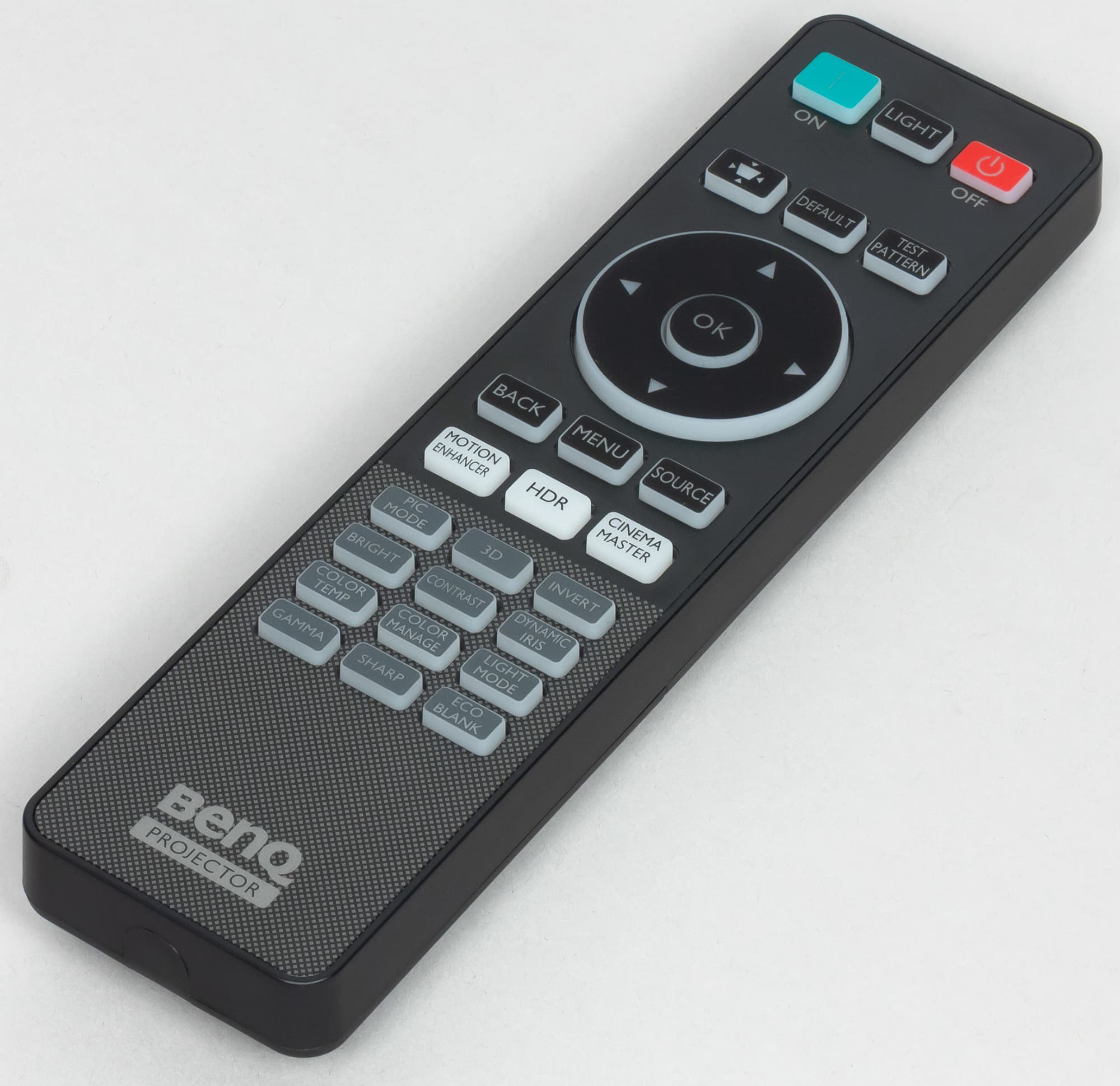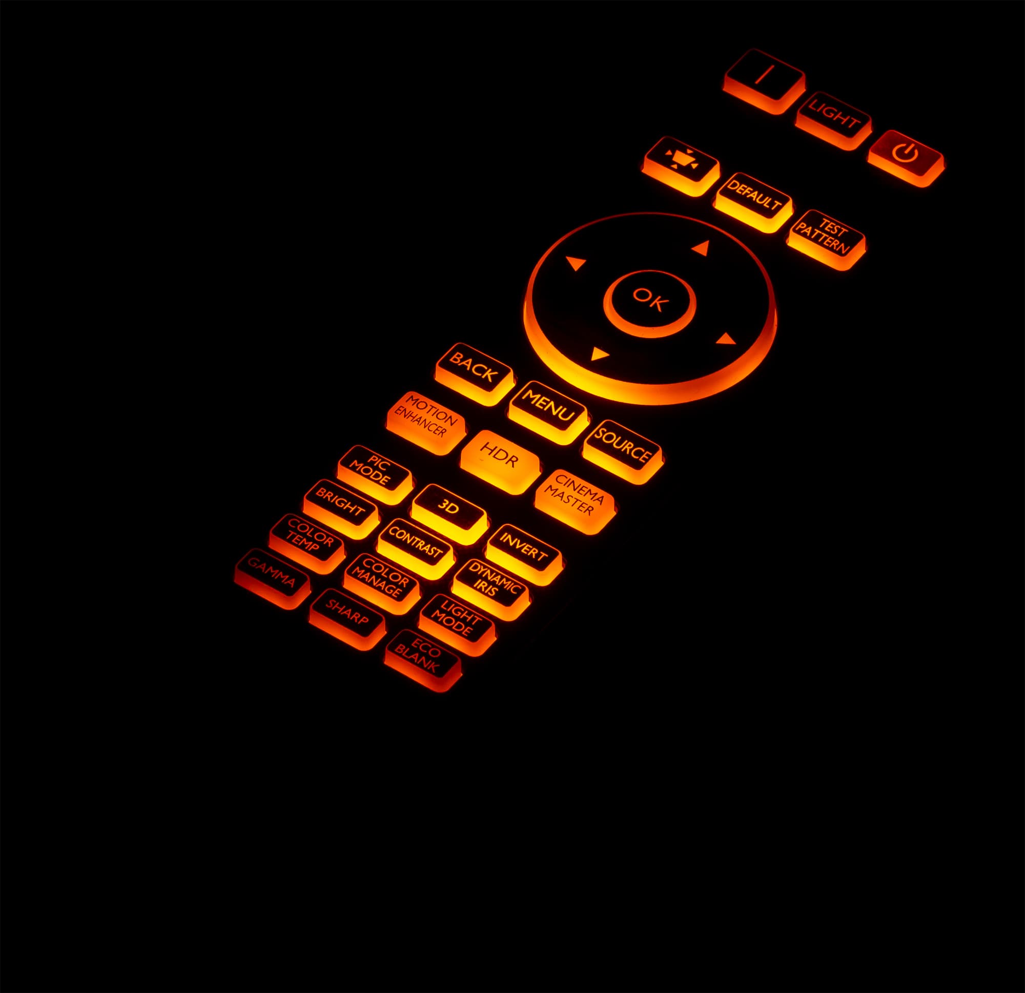 Корпус ИК-пульта дистанционного управления изготовлен из черного пластика с матовой поверхностью. На плоскость с кнопками наклеена пластина из износостойкого пластика. Пульт не маленький. Кнопки достаточно крупные, их не очень много, а надписи используемых часто кнопках читаются хорошо. Материал кнопок — это упругий напоминающий резину пластик. При нажатии кнопки негромко щелкают, а момент срабатывания тактильно хорошо различается. Включение и выключение разнесено на разные кнопки, но при выключении подтверждение все равно запрашивается. Есть достаточно яркая светодиодная подсветка, включающаяся при нажатии на любую кнопку. Подсветка гаснет через 16 секунд после последнего нажатия на кнопки пульта или при нажатии на кнопку Light.