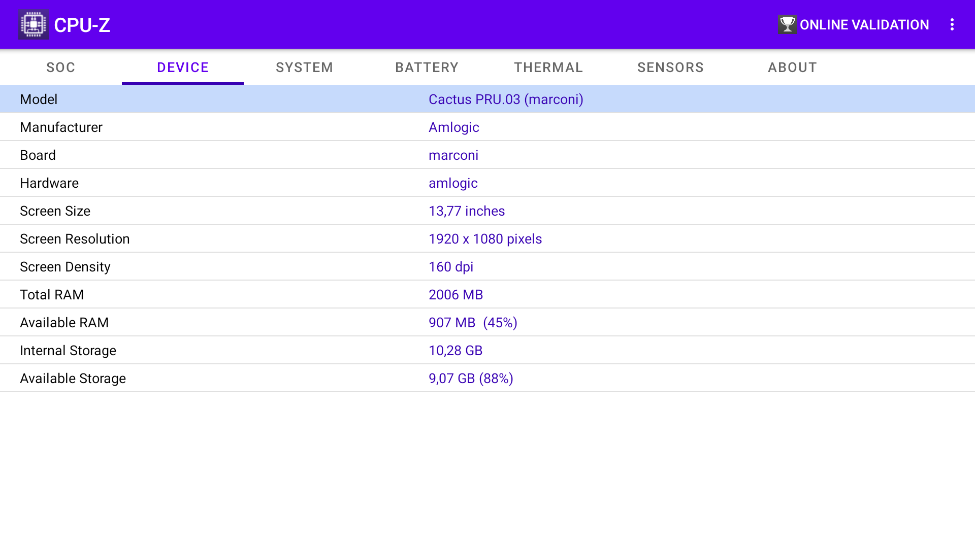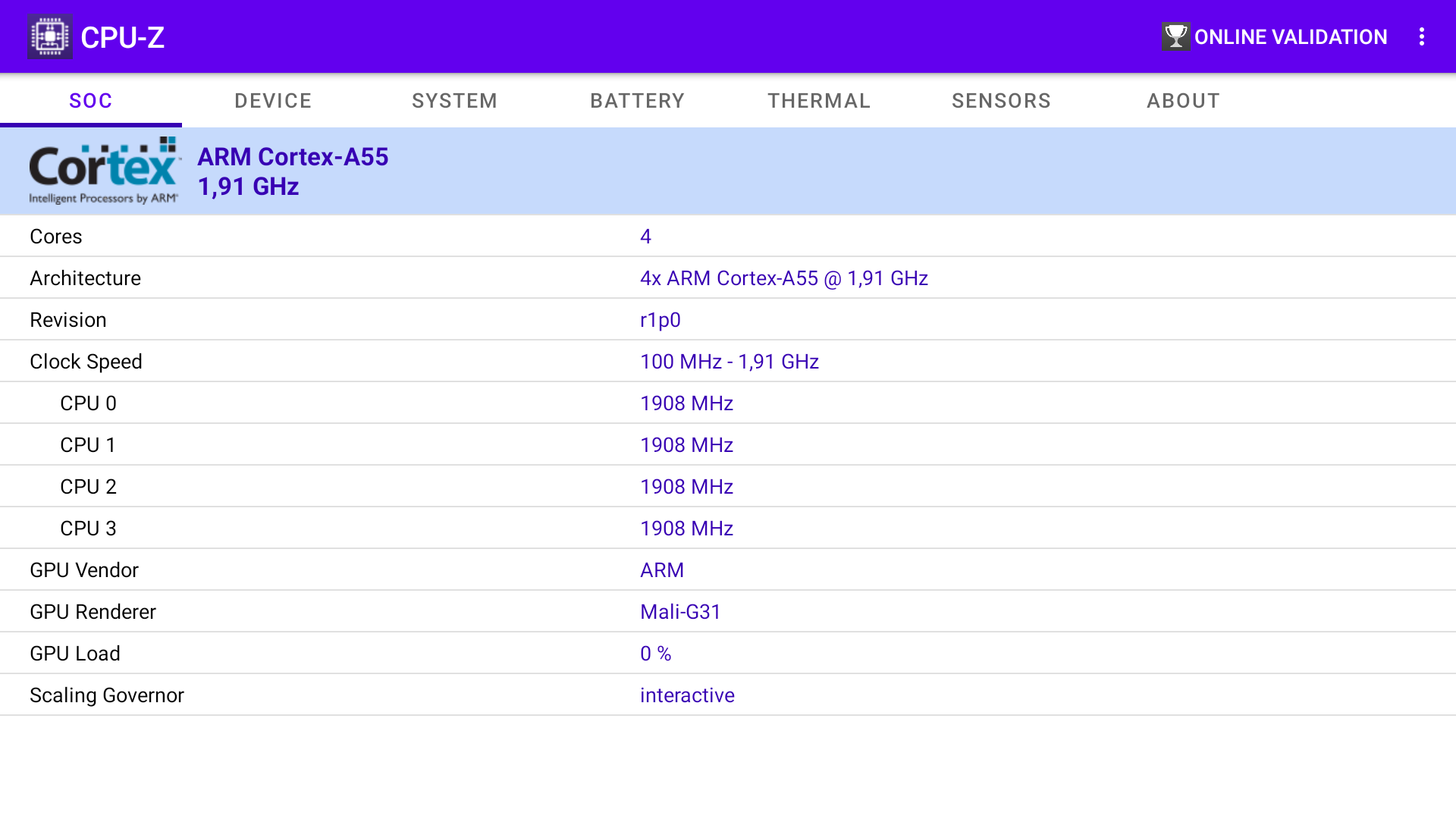 Программной платформой для этого ТВ служит операционная система Android TV, основанная на Android версии 9. Конфигурацию аппаратной части поясняют данные программы CPU-Z: