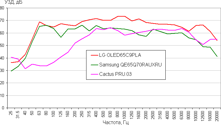 Встроенные громкоговорители для устройства такого размера довольно громкие, но качество звука невысокое — есть паразитные резонансы, низких частот нет, звук в целом резковат и неприятный. Звуки с высокой амплитудой сигнала независимо от выставленной громкости вызывают перегрузку звукового тракта. Близко от проектора, вроде бы, обнаруживается стереофонический эффект, но даже на небольшом расстоянии его уже нет. Сравним АЧХ этого проектора с АЧХ двух телевизоров (АЧХ получена с помощью шумомера при воспроизведении звукового файла с розовым шумом, замер УЗД в интервалах по 1/3 октав):