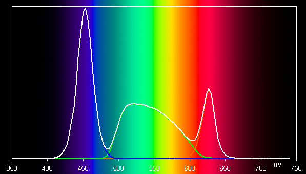 Видно, что цвета хорошо разделены. Узкие пики синего и красного подтверждают наличие синего и красного светодиодов, а широкий горб зеленого доказывает, что его получают с помощью люминофора.