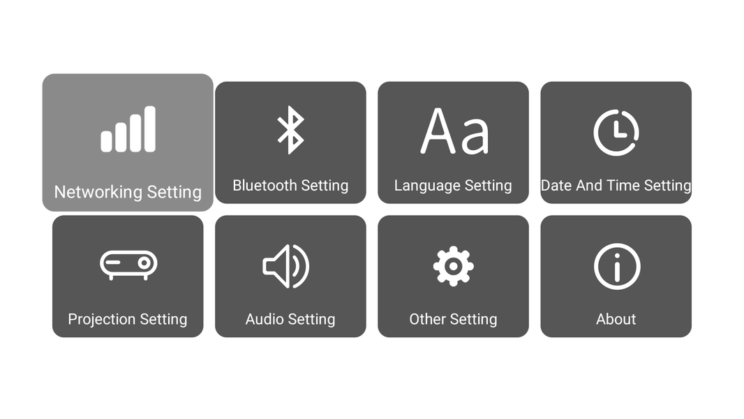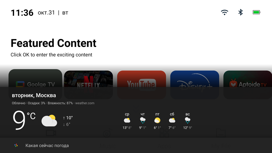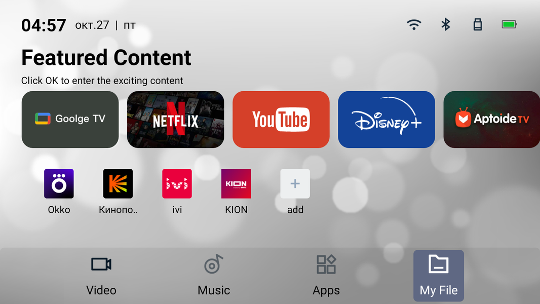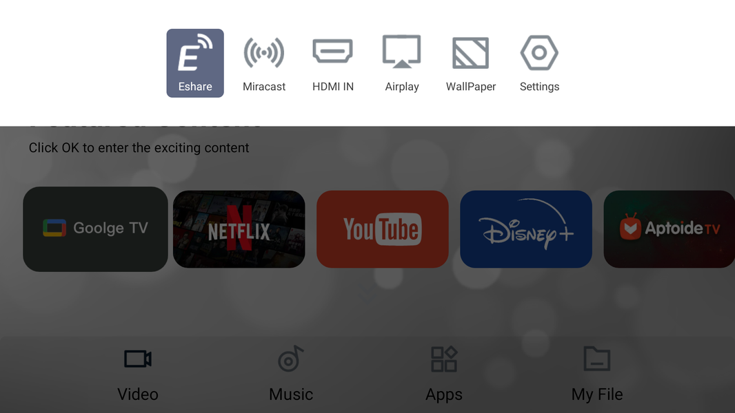 В нижней части экрана есть значки быстрого доступа к приложениям двух категорий — видео и музыка, при этом что именно будет в этих категориях, определяет сам пользователь. Выбор третьего значка в этом ряду выводит список всех установленных приложений, а четвертый отвечает за запуск встроенного файлового менеджера. В верхней части страницы размещены часы, дата и значки состояния. Если продолжить прокрутку страницы вверх, то появляются значки доступа к режимам EShare, Miracast и Airplay, переключения на вход HDMI, выбора фонового изображения для Главного экрана и входа в меню с базовыми настройками из которого можно перейти с списку с другими настройками.