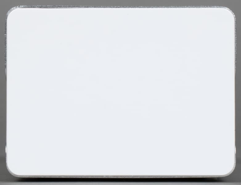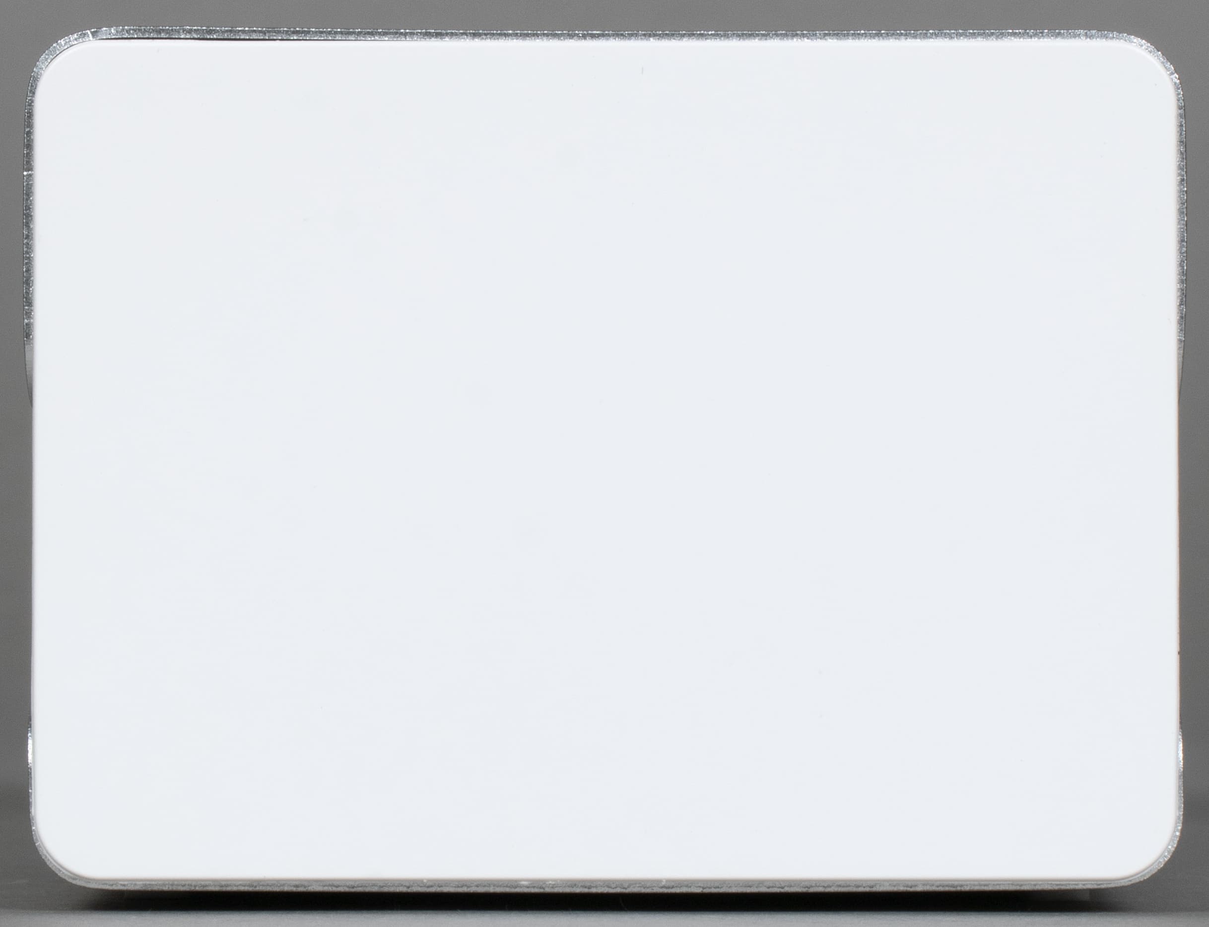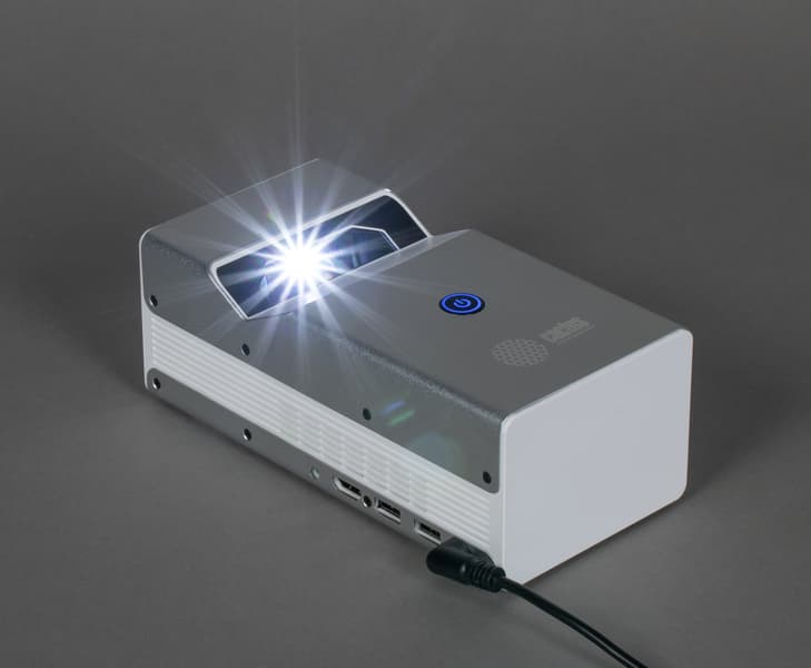 Корпус проектора изготовлен из белого пластика в основном с матовой поверхностью. Сверху и снизу закреплены алюминиевые накладки с матовой серебристой поверхностью. На верхней панели в треугольной выемки есть защитное стекло, прикрывающее фронтальное зеркало сложной формы.
