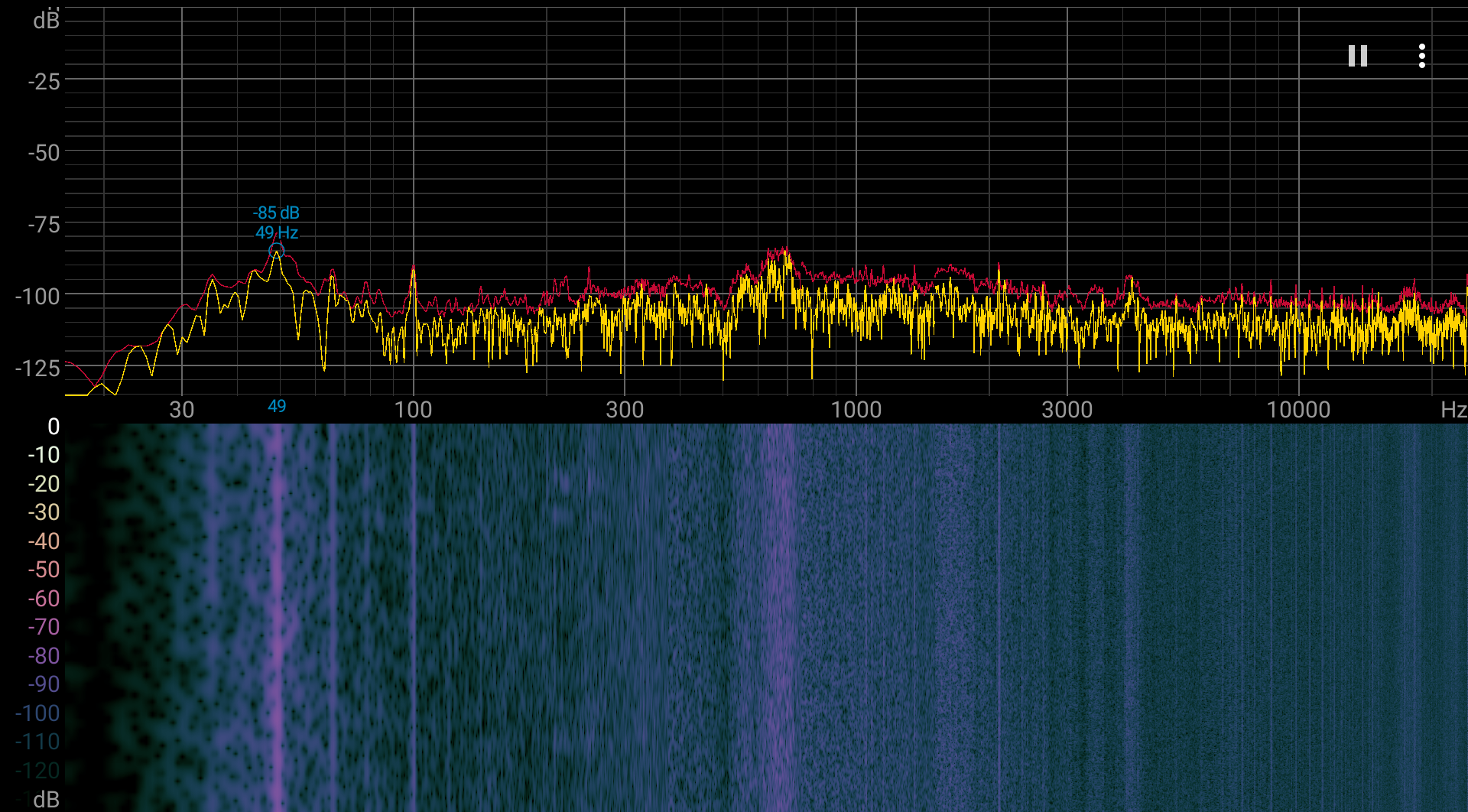 Проектор довольно тихий. Спектрограмма шума от системы охлаждения не идеально ровная, однако выраженных пиков с высокой интенсивностью нет (низкочастотный пик во внимание можно не принимать), характер звука ровный и никакого дискомфорта не доставляет.