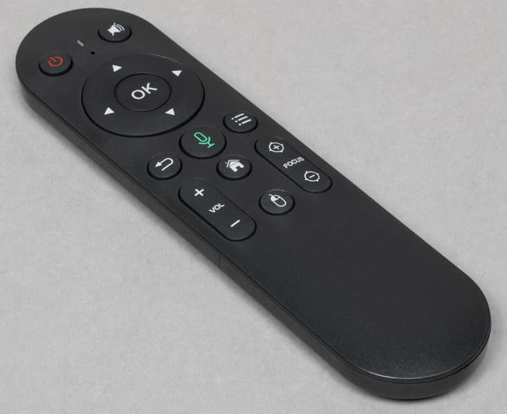 Обозначения кнопок достаточно контрастные и крупные. При нажатии кнопки негромко щелкают. Пульт гибридный, он может работать как по ИК, так и по Bluetooth. По ИК пульт работает до сопряжения с проектором или тогда, когда проектор находится в режиме ожидания. Во всех остальных случаях ИК-передатчик не работает, и команды передаются по Bluetooth. В передней части пульта есть индикатор (мигает красным при передаче команд) и микрофон. Есть упрощенная функция координатного ввода — после нажатия на кнопку с изображением мышки ее курсор можно передвигать курсорными кнопками пульта, а центральная кнопка отвечает за нажатие на левую кнопку мыши. Также никто не мешает подключить к проектору настоящие клавиатуру (только по USB, так как в случае Bluetooth не отображается код для подключения) и мышь (по USB или по Bluetooth). Поддерживается прокрутка колесиком. Нажатие на правую кнопку мыши соответствует отмене действия или возврату назад. Задержка перемещения курсора мыши относительно движения самой мышью великовата, но еще терпимая. Нужно отметить, что в целом штатный интерфейс самого проектора хорошо оптимизирован для использования только курсорных кнопок комплектного пульта ДУ.