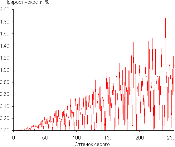 Для оценки характера роста яркости на шкале серого мы измерили яркость 256 оттенков серого (от 0, 0, 0 до 255, 255, 255). График ниже показывает прирост (не абсолютное значение!) яркости между соседними полутонами: