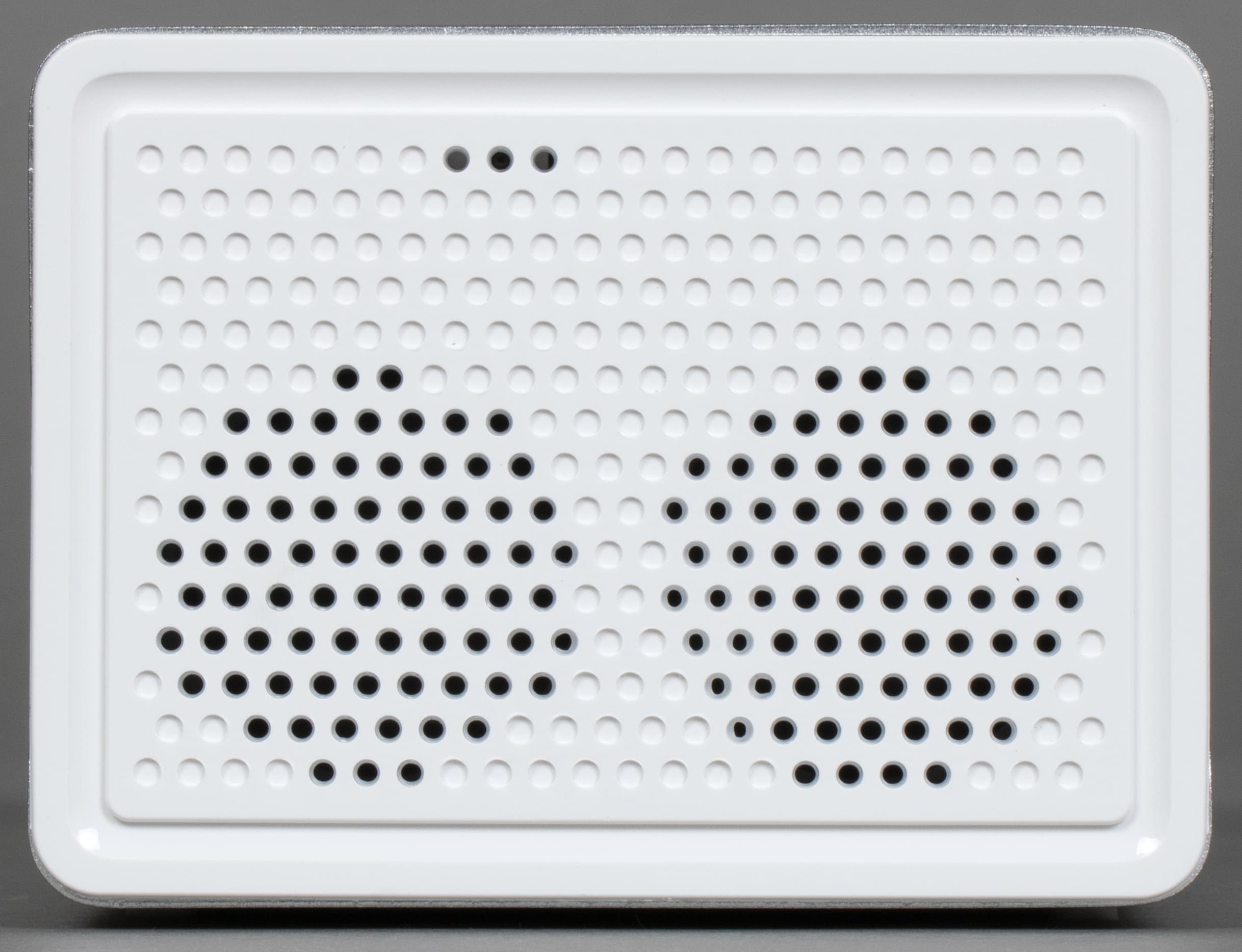 Спереди ничего нет. За решетками на задней, обращенной к зрителю панели, находятся встроенные громкоговорители и ИК-приемник сигналов пульта ДУ.