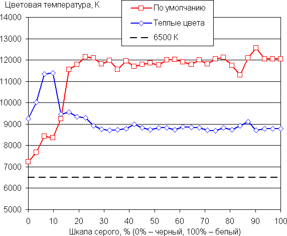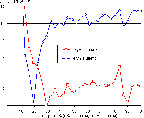 Графики ниже показывают цветовую температуру на различных участках шкалы серого и отклонение от спектра абсолютно черного тела (параметр ΔE) для режима по умолчанию и после выбора профиля с более теплыми оттенками: