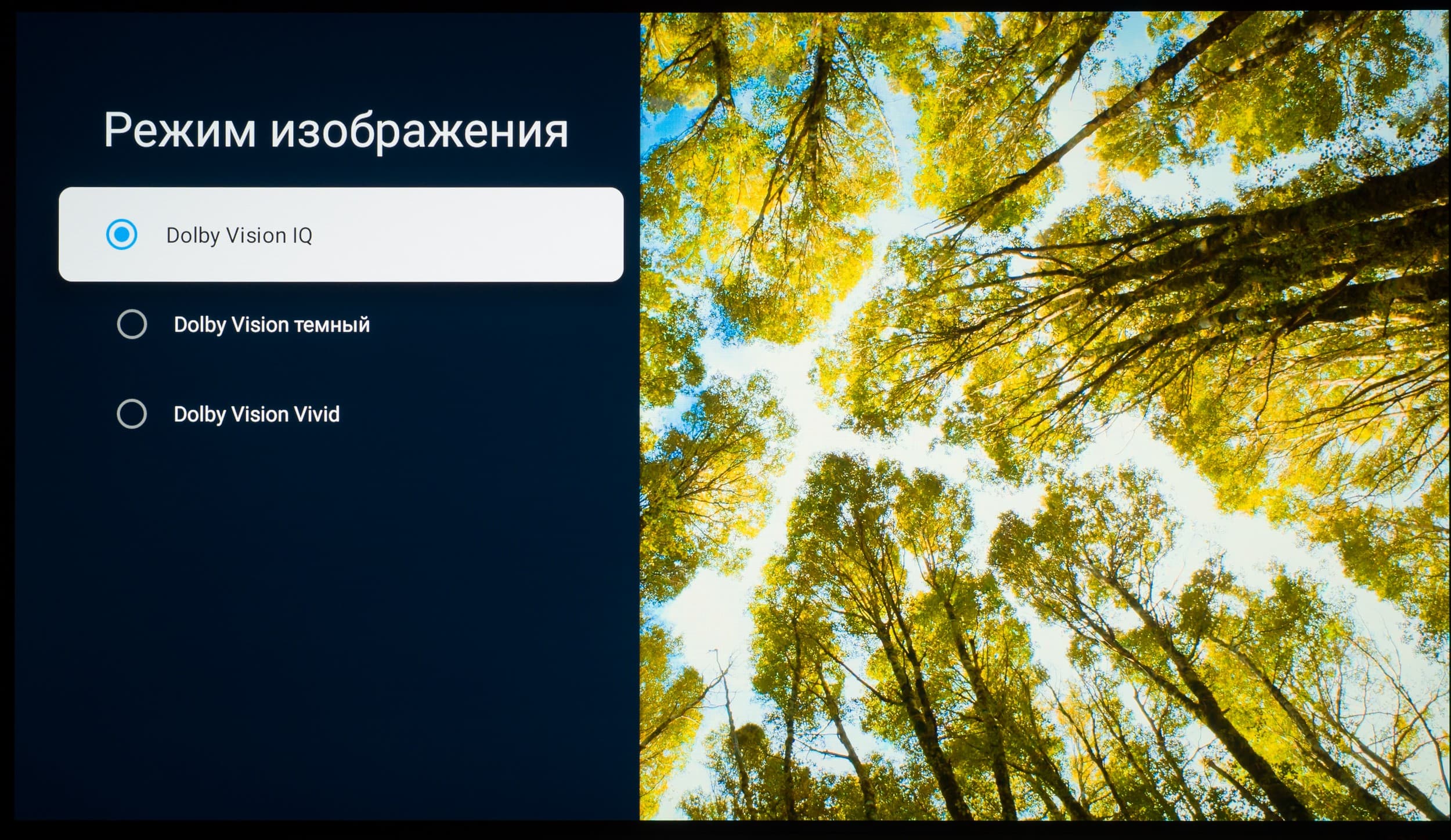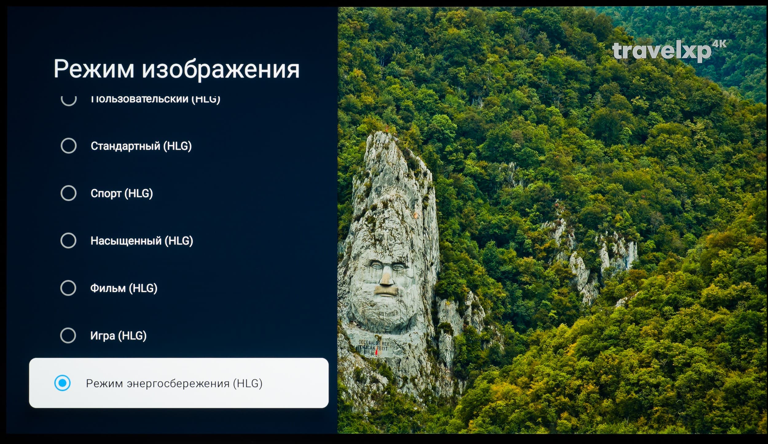 Вместе с тем, телевизор прекрасно работает со всеми основными стандартами HDR. Выше представлены примеры подобных роликов в форматах Dolby Vision (активируется уведомление в верхнем левом углу экрана) и HDR10/HLG, для которых доступен выбор режимов представления.