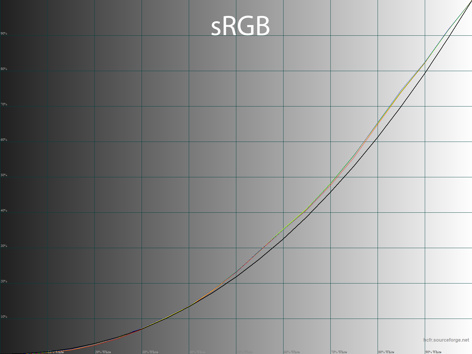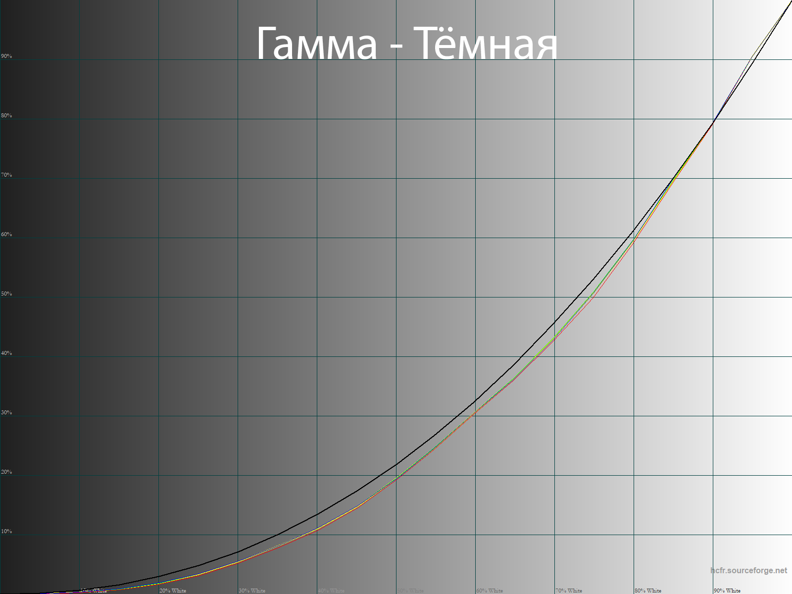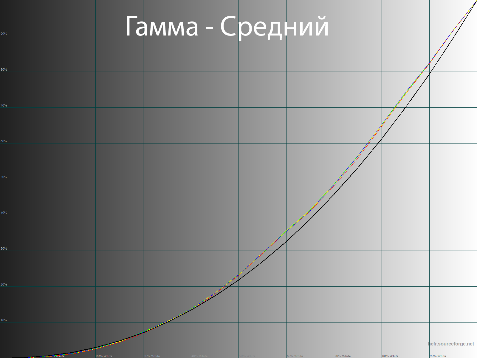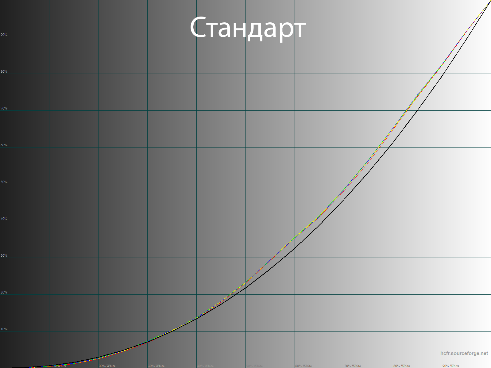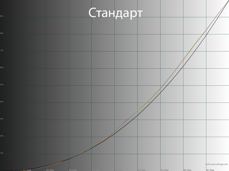 Ниже приведен спектр для белого поля (белая линия), наложенный на спектры красного, зеленого и синего полей (линии соответствующих цветов) для режима экрана «Стандарт» с полной цветовой гаммой: