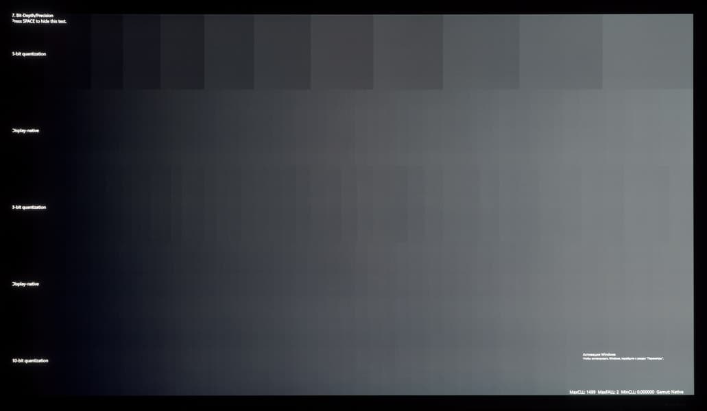 Качественную оценку мы начнем с демонстрации градиентов при выводе изображения в 8-битном и 10-12-битных режимах (программная эмуляция со стороны ТВ либо GPU в случае подключения к ПК/ноутбуку).
