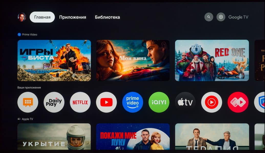Первоначальную настройку системы можно провести с помощью входа в свой Google-аккаунт прямо с телефона, что позволяет сэкономить львиную долю времени. Главный экран Google TV многим хорошо знаком, поскольку на 95% соответствует крайне популярной программной оболочке Android TV.