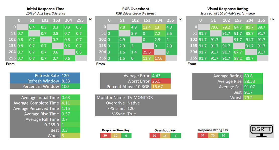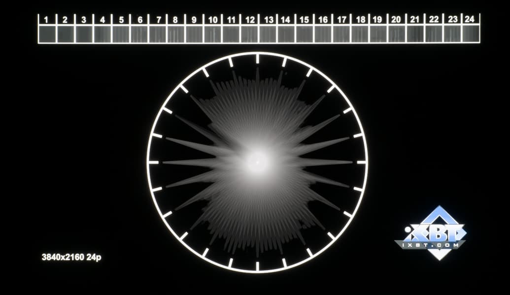 Время отклика очень мало, так как состояние пикселей меняется практически мгновенно. На некоторых переходах выявлены артефакты на среднем уровне, однако учитывая фантастическую скорость отклика матрицы, обычный человек их никогда не увидит. Такой скорости матрицы достаточно даже для очень динамичных игр, не говоря уже о других задачах. Отдельно отметим, что реальное время отклика протестированного ТВ на некоторых используемых переходах может быть даже ниже. Это связано с аппаратными ограничениями используемого прибора OSRTT, что теоретически снижает точность измерений сверхмалых времен отклика.