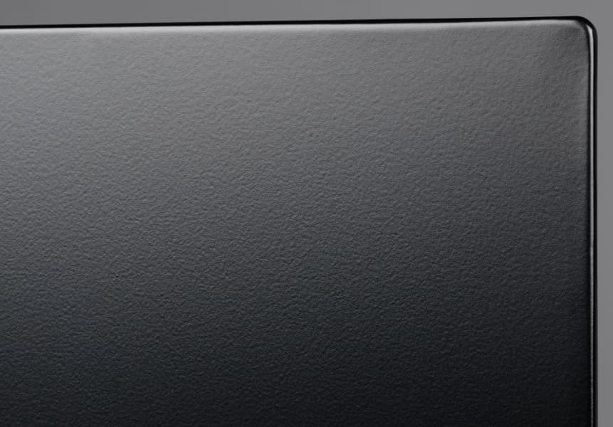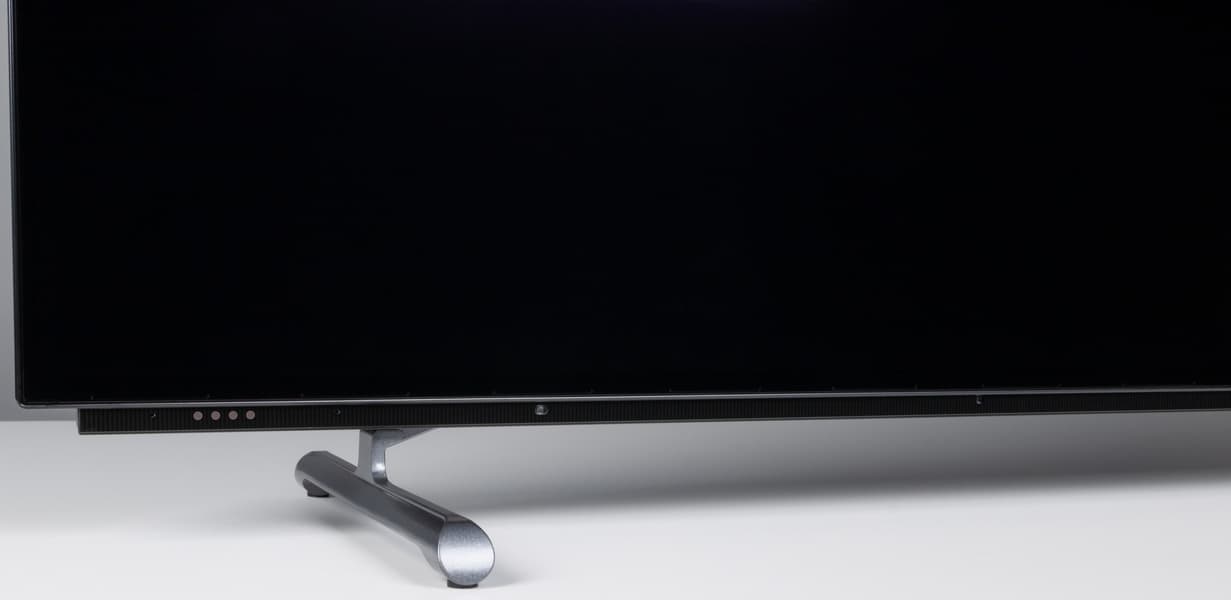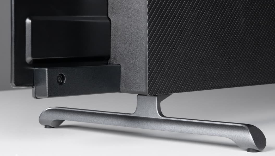 Дизайн телевизора строгий, «безрамочный», преимущественно используются элементы черного (или близкого к нему) цвета. Экран не имеет рамки в том смысле, что на его монолитной поверхности нет накладных заметно выступающих вперед за плоскость элементов, есть только узкое обрамление из алюминиевого профиля. Этот профиль анодирован и окрашен в темно-серый цвет.