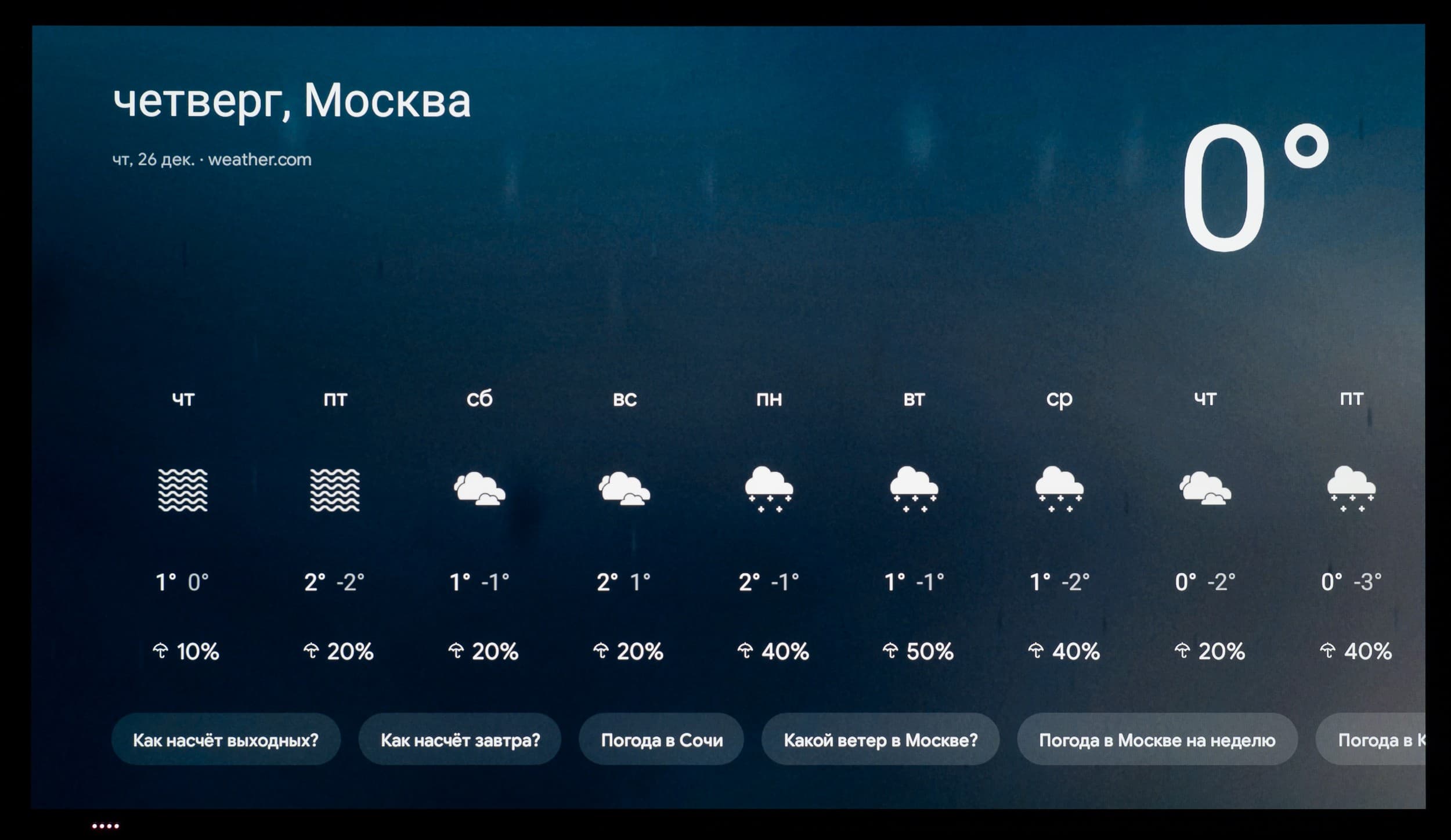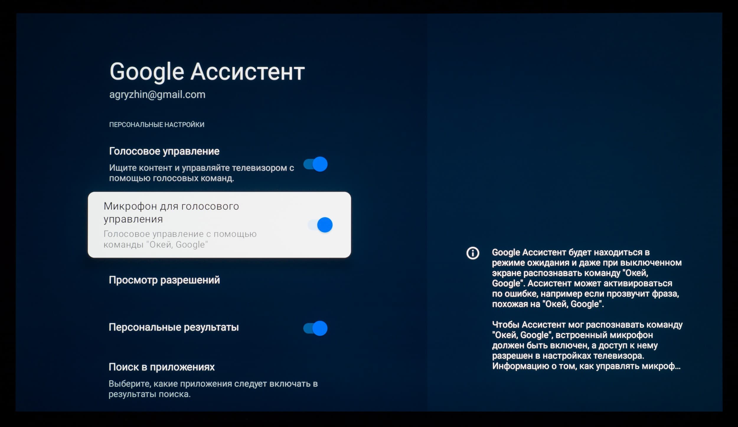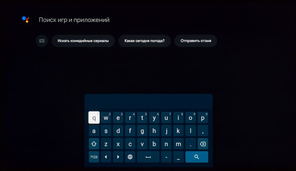 Голосовой помощник Google запускается при нажатии на кнопку с разноцветным микрофоном (для ввода голосовой команды держать ее не нужно), также его можно запустить с домашней страницы или нажатием на мультимедийную кнопку поиска на цифровой клавиатуре. Этот помощник позволяет найти контент, который предоставляют ряд программ, и может ответить на какие-то вопросы (показывает и проговаривает ответ), например какая сейчас погода за окном. Пульт желательно держать поближе к себе, поскольку встроенный в пульт ДУ микрофон не является высокочувствительным.