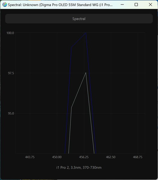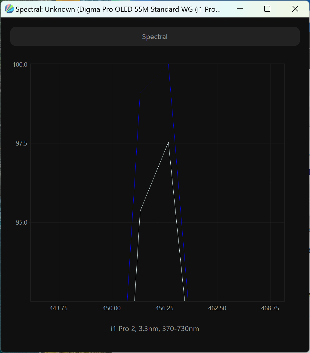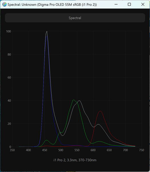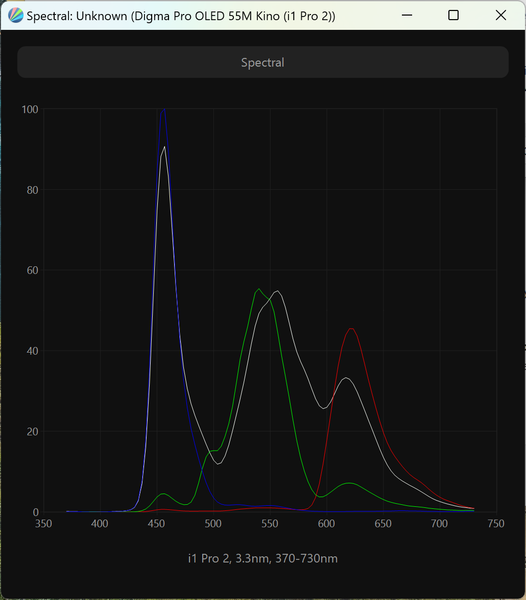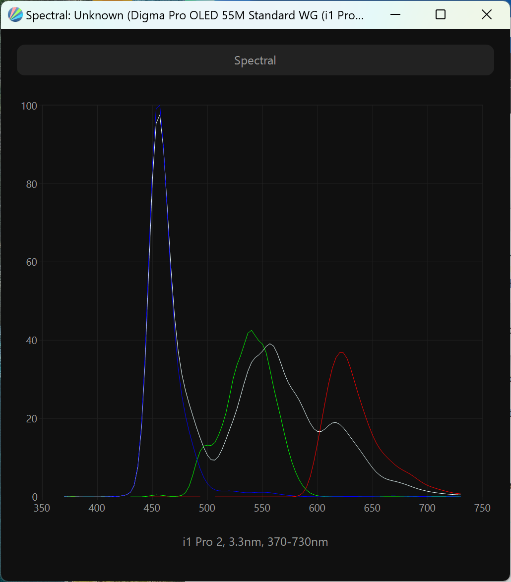 Виден сдвинутый пик синего, приходящийся на 456 нм, что обеспечивает снижение нагрузки на глаза и возможность получения различных современных сертификатов безопасности. Спектры компонент хорошо разделены, что и позволяет получить широкий цветовой охват. Перекрестное подмешивание незначительное, то есть цветовой охват в случае профиля «Стандарт» близок к оригинальному охвату экрана ТВ.