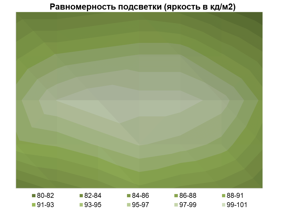 Измерения яркости проводились в 35 точках экрана, расположенных с шагом 1/6 от ширины и высоты экрана. Границы экрана не включены, настройки установлены в значения, обеспечивающие яркость белого поля в 86 нит в центральной части экрана.