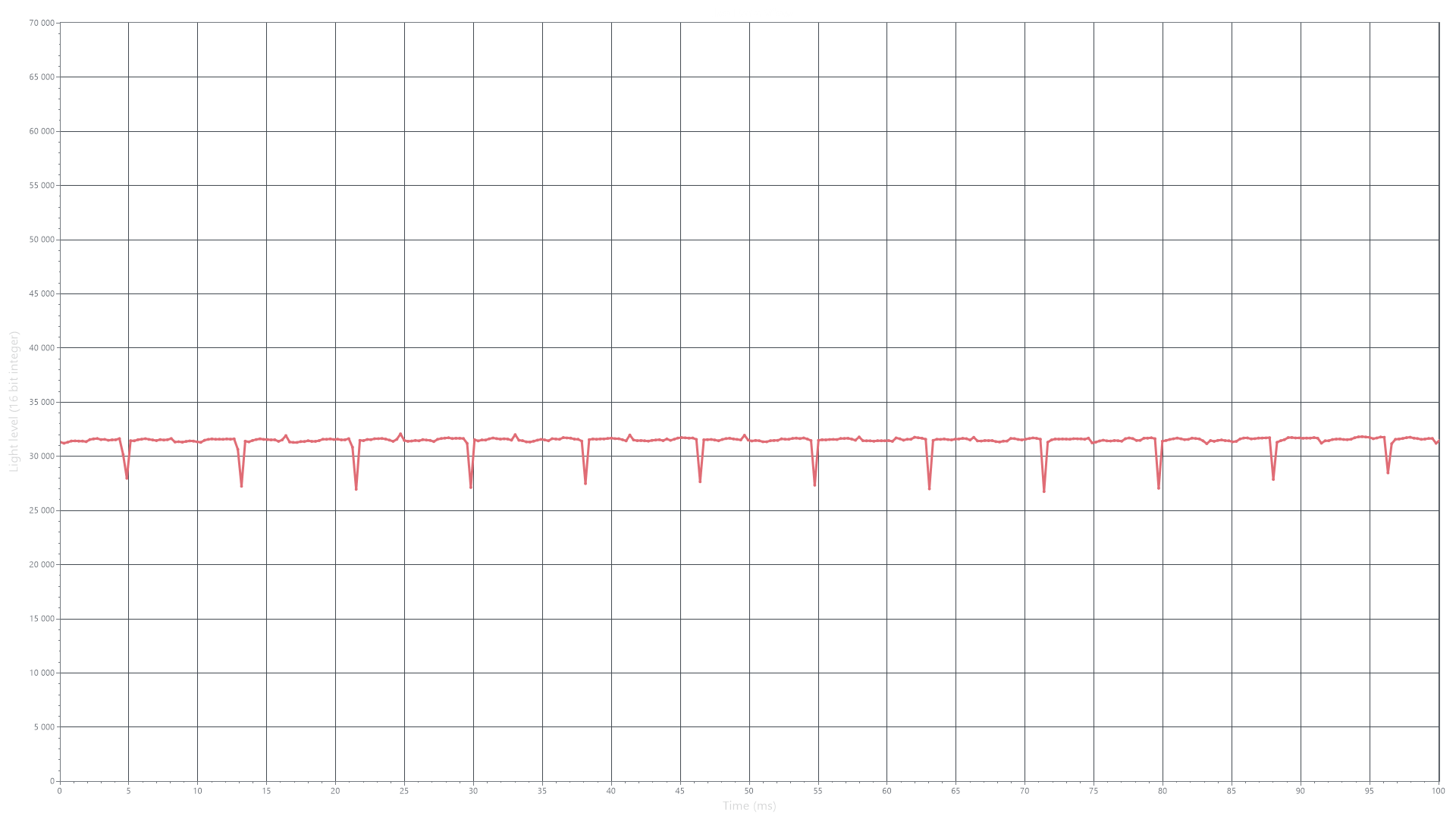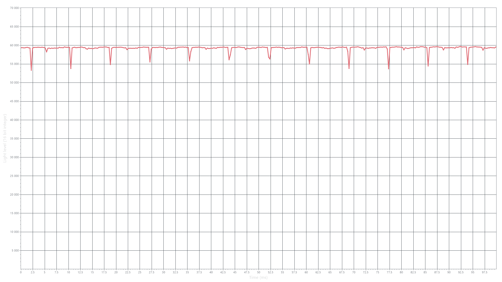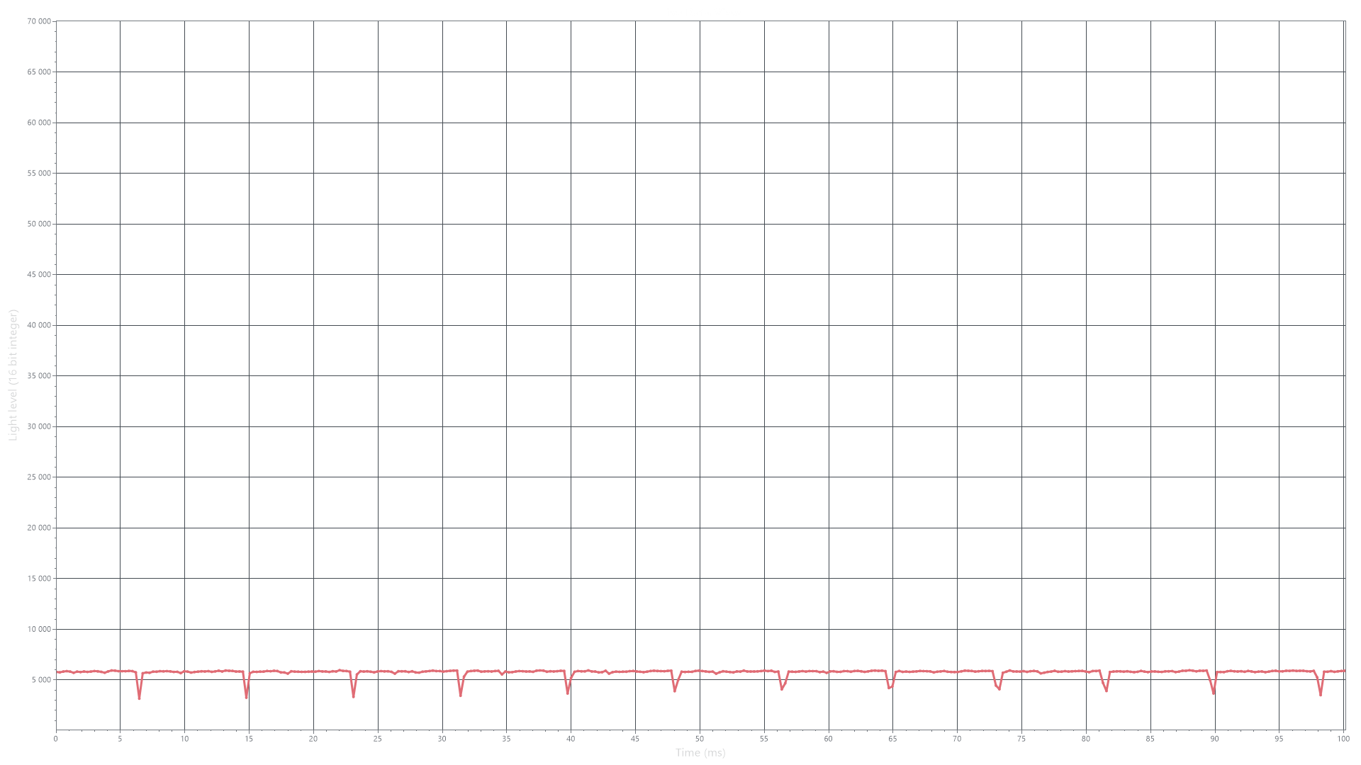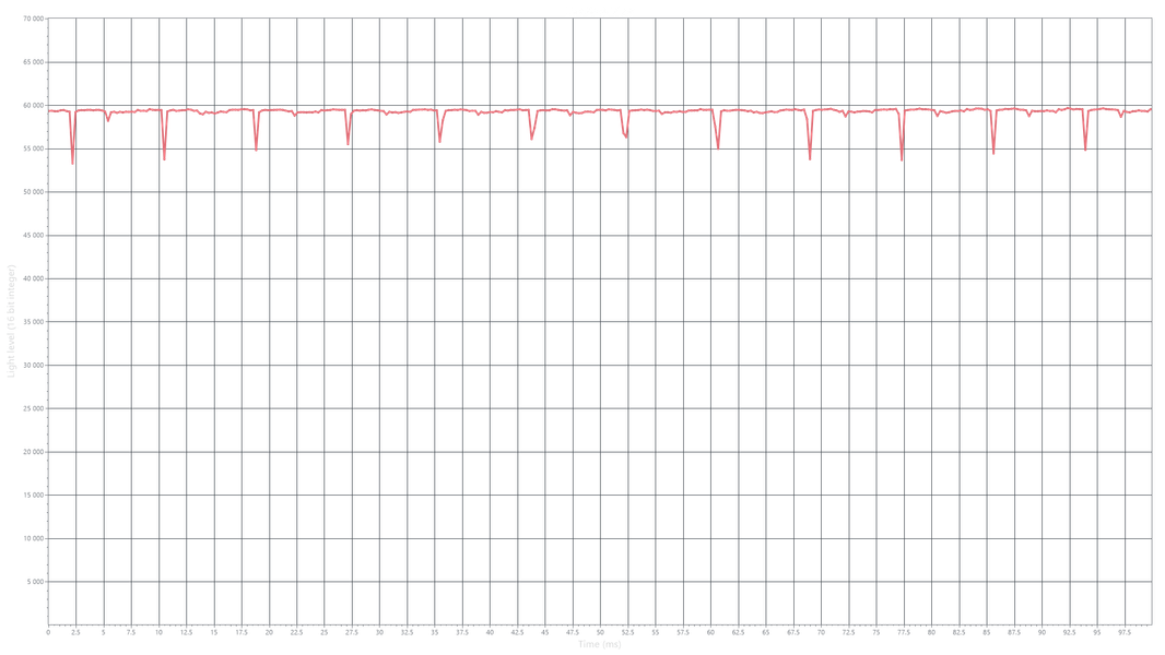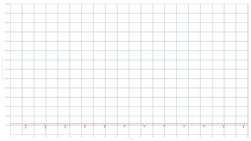 На любом уровне яркости видимое мерцание отсутствует, его не выявляет и тест на стробоскопический эффект. Регистрация зависимости яркости от времени при различных уровнях яркости выявила модуляцию яркости с очень высоким коэффициентом заполнения, что и объясняет отсутствие мерцания.