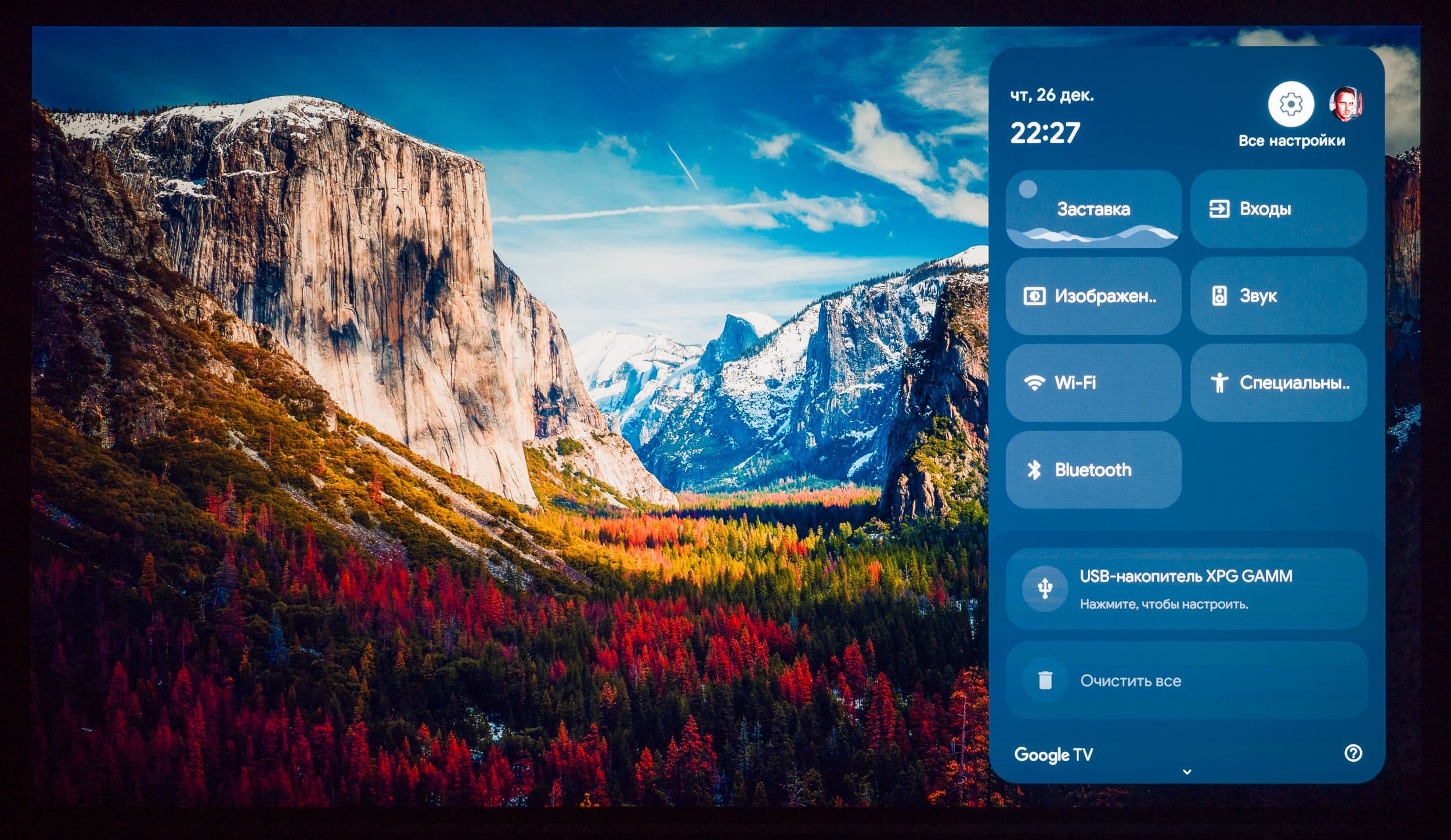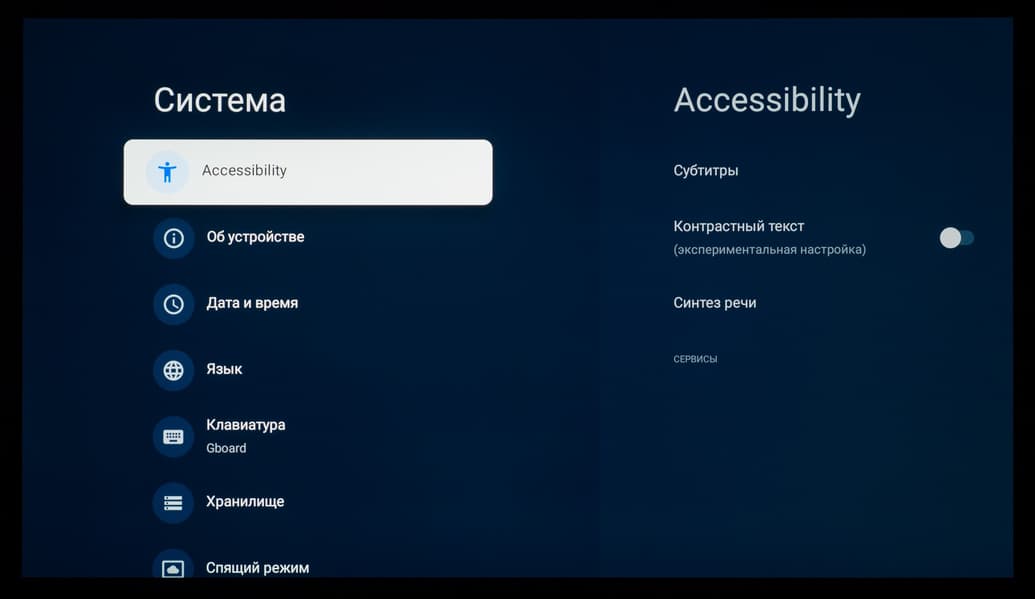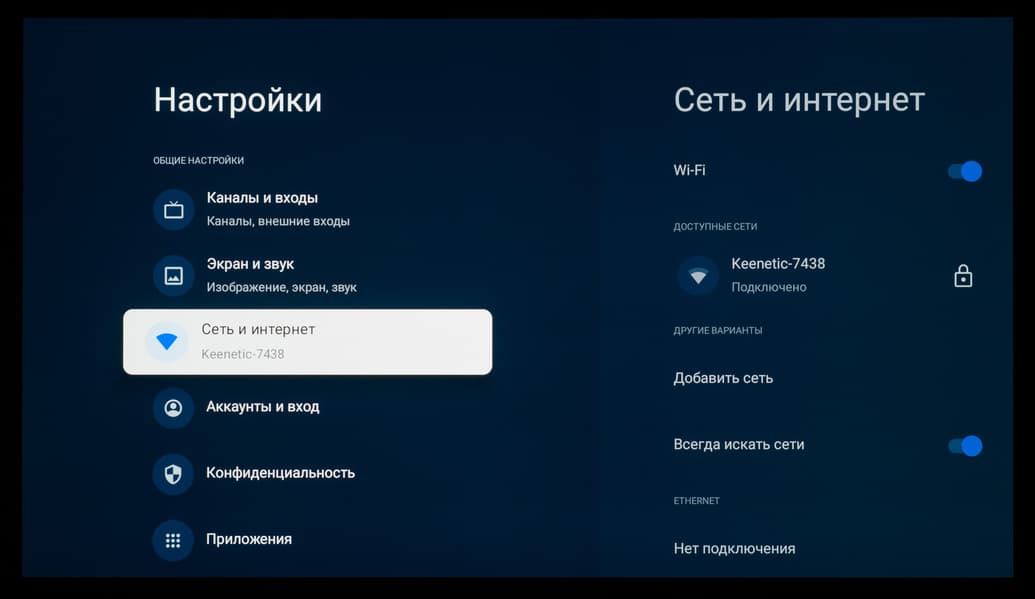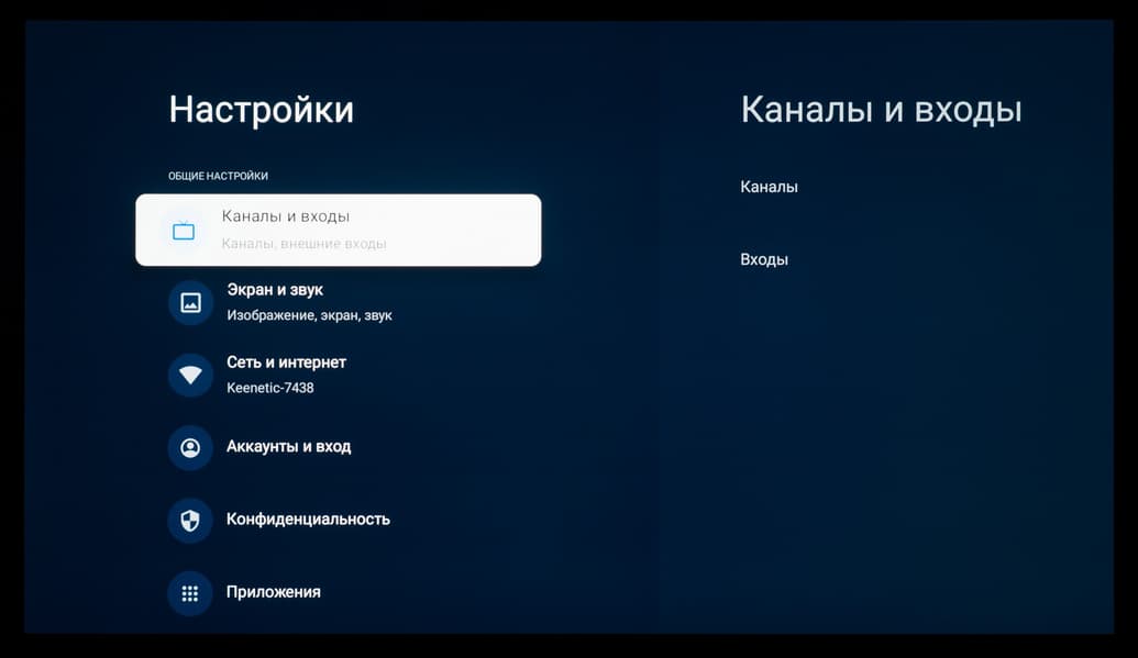 Основной блок настроек изображения и звука, доступный при работе с любым подключением и при выводе любого контента, представлен в хорошо знакомом виде — как у всех ТВ-устройств с Google TV на борту, в виде бокового меню (слева). Есть отдельный блок с быстрым доступом к основным разделам и функциям, а также еще один блок с настраиваемыми функциями быстрого доступа, добавленный разработчиками Digma Pro. Последний вызывается отдельной клавишей на пульте ДУ.