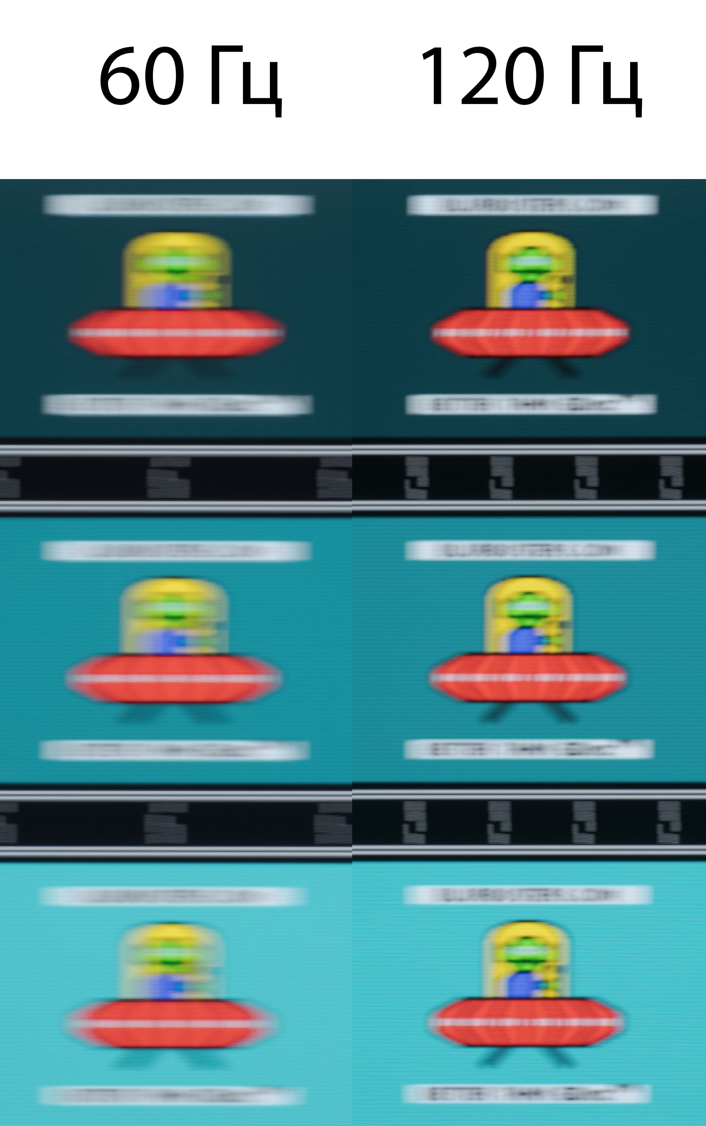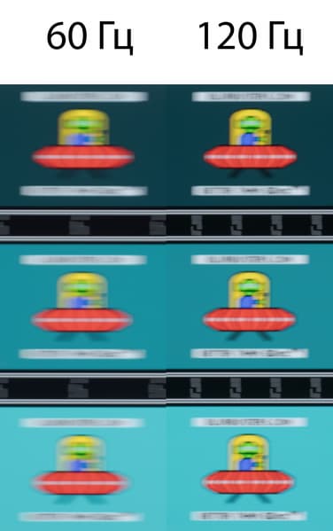 Для наглядного представления о том, что на практике означает такая скорость матрицы и какие могут быть артефакты от разгона, приведен снимок выше, полученный с помощью движущейся камеры. Подобные снимки показывают, что видит человек, если он следит глазами за двигающимся на экране объектом. Видно, что при прочих равных условиях четкость изображения значительно повышается по мере роста частоты обновления.