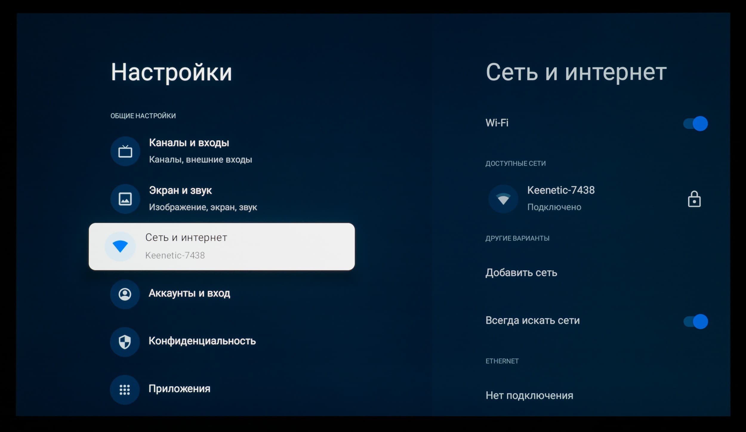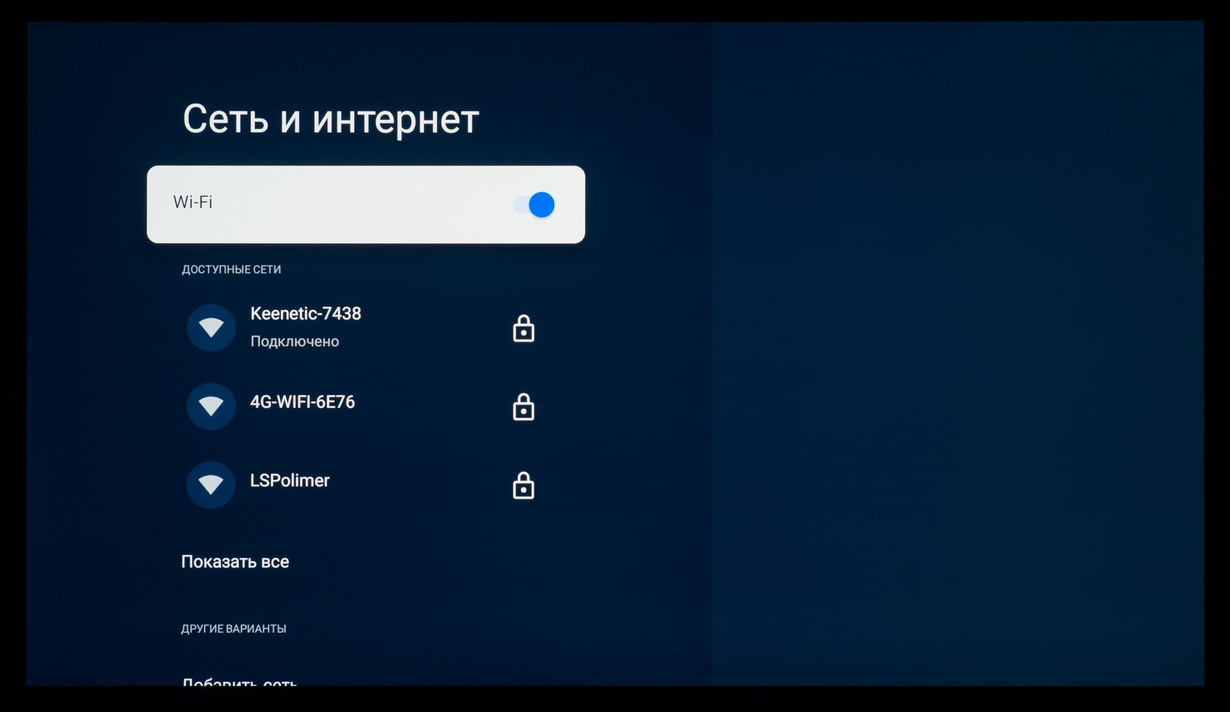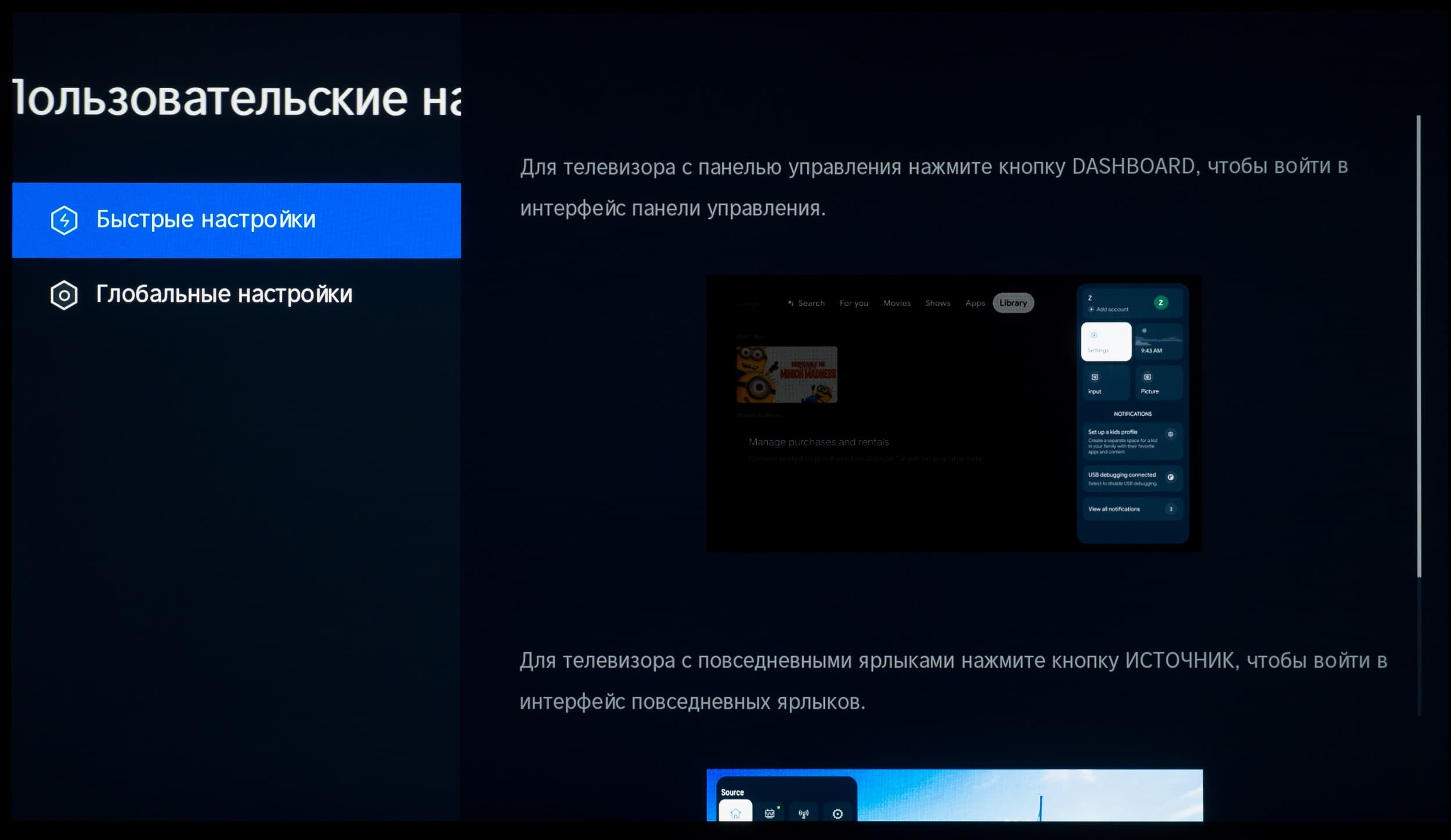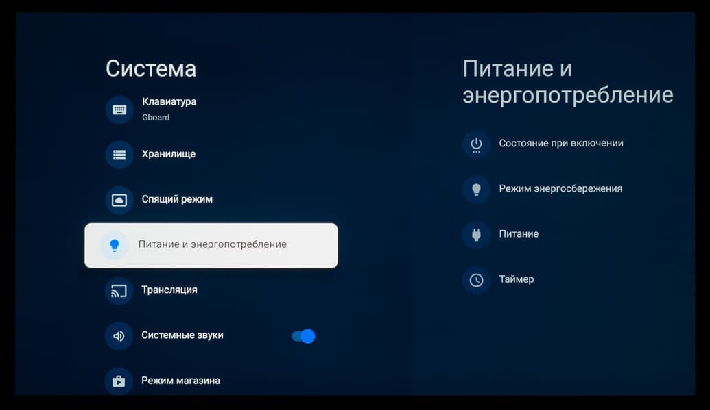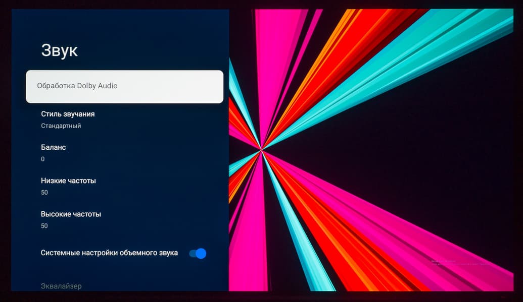 Что касается всех остальных настроек, то из-за использования оболочки Google TV они перебрались на отдельный экран, закрывающий собой воспроизводимый контент. Основной OSD-экран построен по принципам блочной структуры, со сдвигом вправо при наличии дополнительных подразделов.