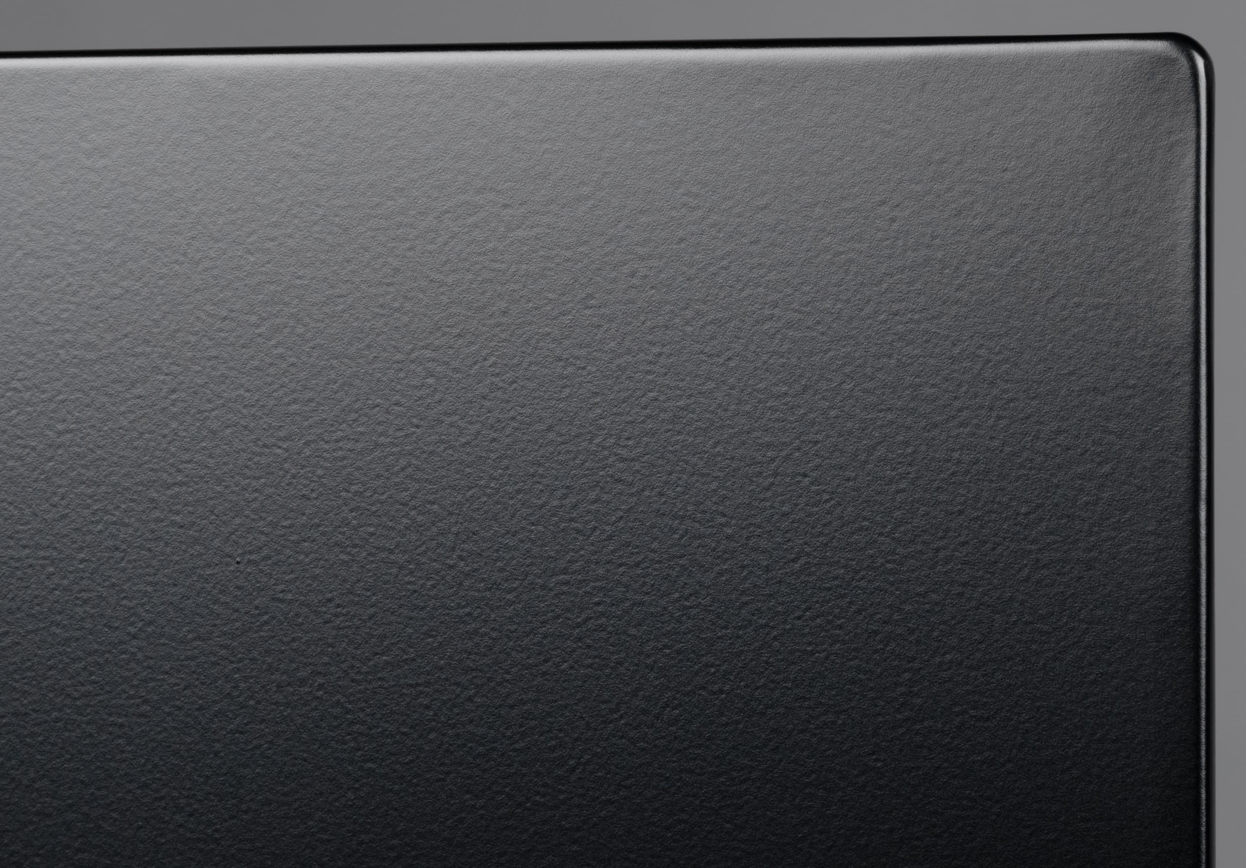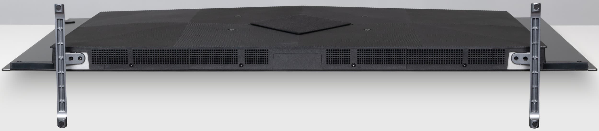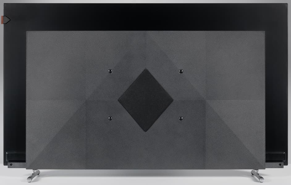 Сзади телевизор выглядит аккуратно. Задняя панель в верхней части изготовлена из тонкого листа стали и имеет стойкое серое матовое покрытие с легким эффектом шлифовки. Сверху и с боков панель заходит на торцы и образует окантовку экрана.