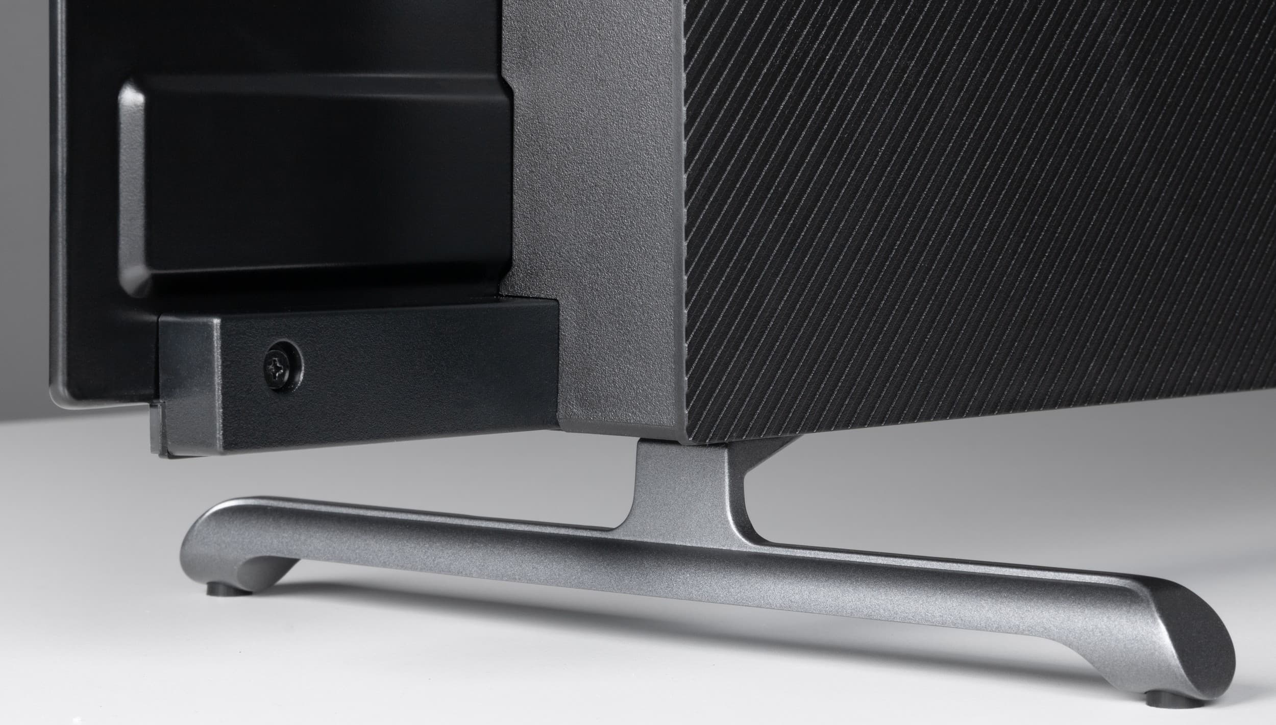 Несмотря на свою легкость (две ножки прибавляют телевизору всего порядка 300-350 г) они надежно удерживают крупный корпус ТВ с еле заметным наклоном назад (порядка одного градуса), без лишних содроганий. Другими словами — жесткость собранной конструкции достаточная.