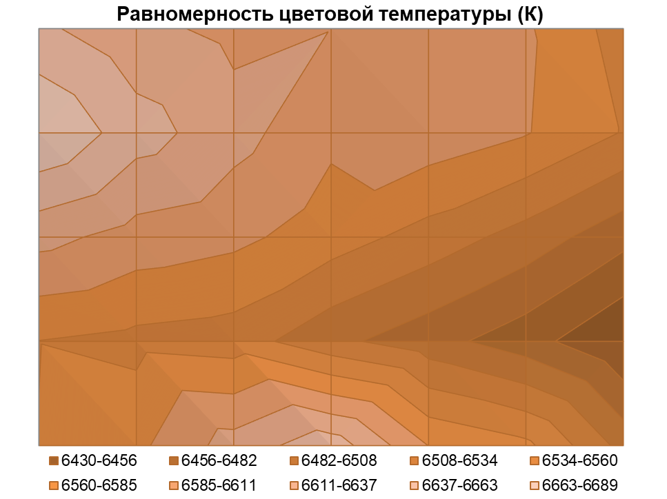 Нет претензий и к равномерности цветовой температуры: среднее отклонение от центральной точки составило всего 0,7%, а максимальное — 2,2%. Вариация ЦТ оказалась близка к 250 К, что будет сложно заметить в реальном использовании.