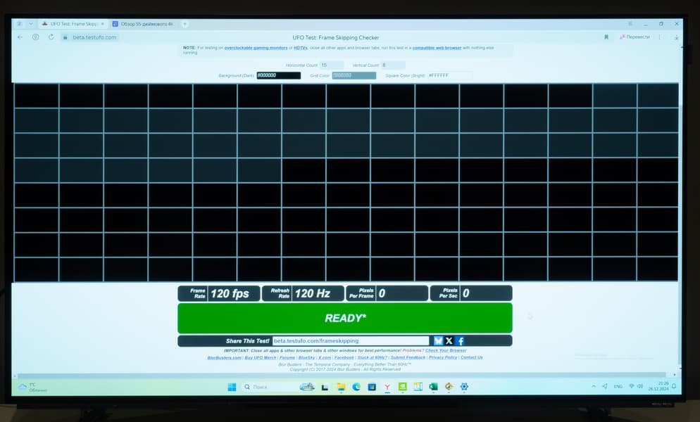 При установке частоты обновления 120 Гц пропуск кадров на телевизоре Digma Pro не выявлен — проверено специальным тестом Blur Busters (TestUFO).