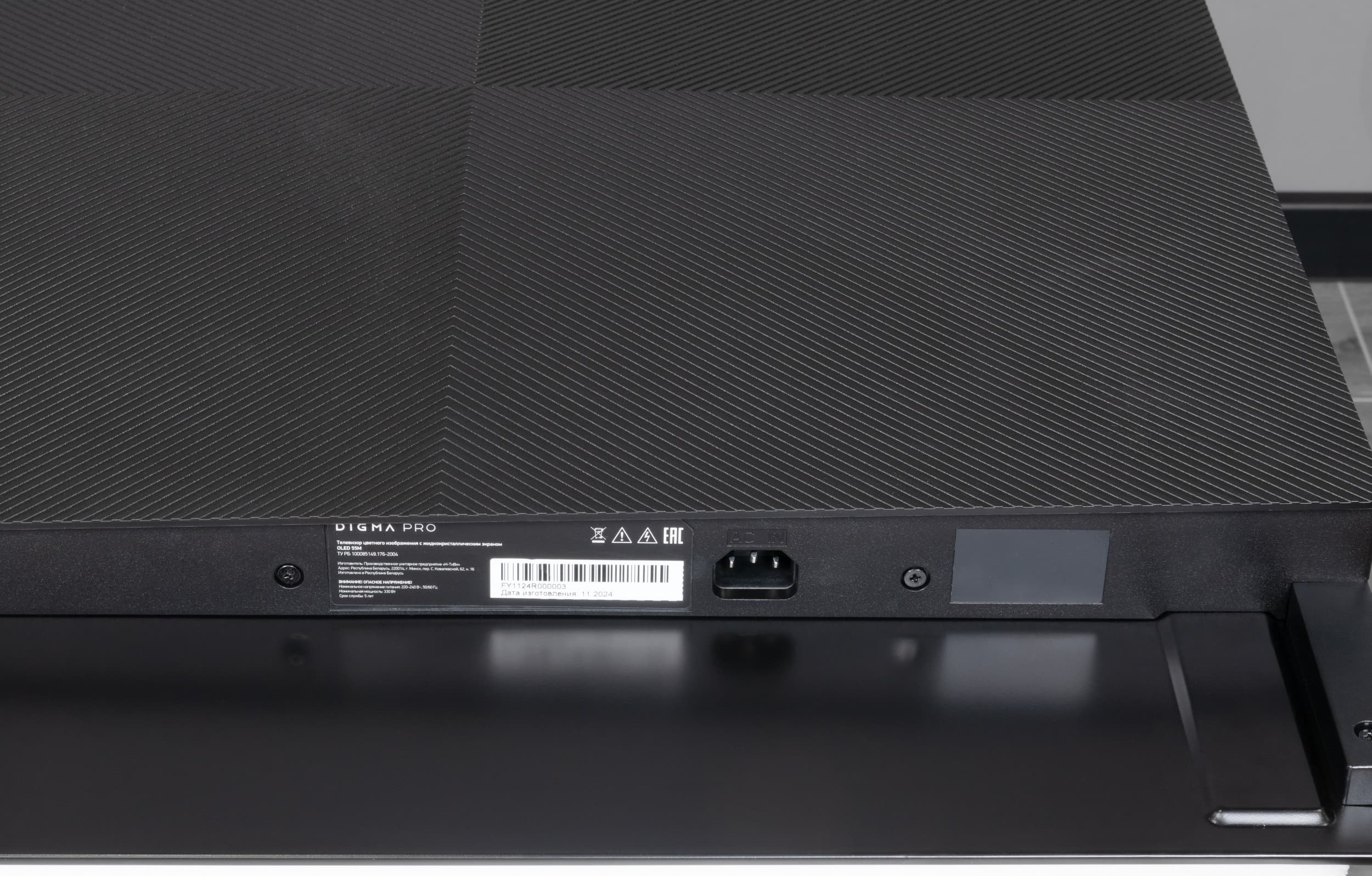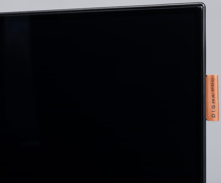 На принадлежность ТВ к бренду Digma Pro указывает небольшой пластиковый шильдик (издалека выглядит как кусочек светло-коричневой кожи) с нанесенным логотипом.