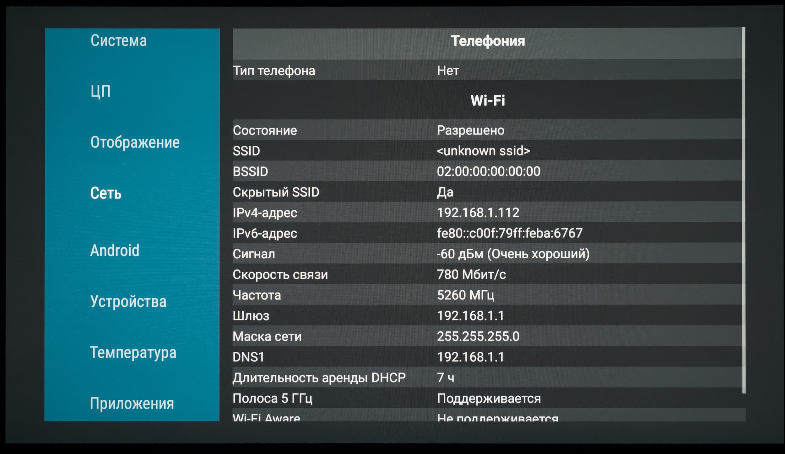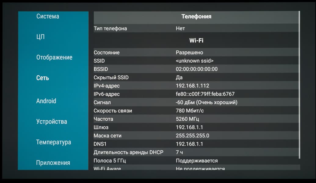 В развернутой сети 5 ГГц на базе роутера Keenetic Hopper (KN-3810), при нахождении телевизора в 5 метрах по прямой от него с преградой в виде монолитной стены, телевизор Digma Pro OLED 55M продемонстрировал стабильную скорость подключения 780 Мбит/c (тип подключения — 11ac/k/r/v, 2×2 80 МГц), которая иногда становилась выше. Это очень высокий результат.