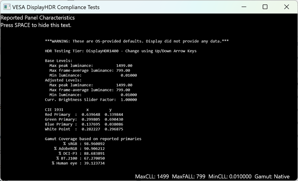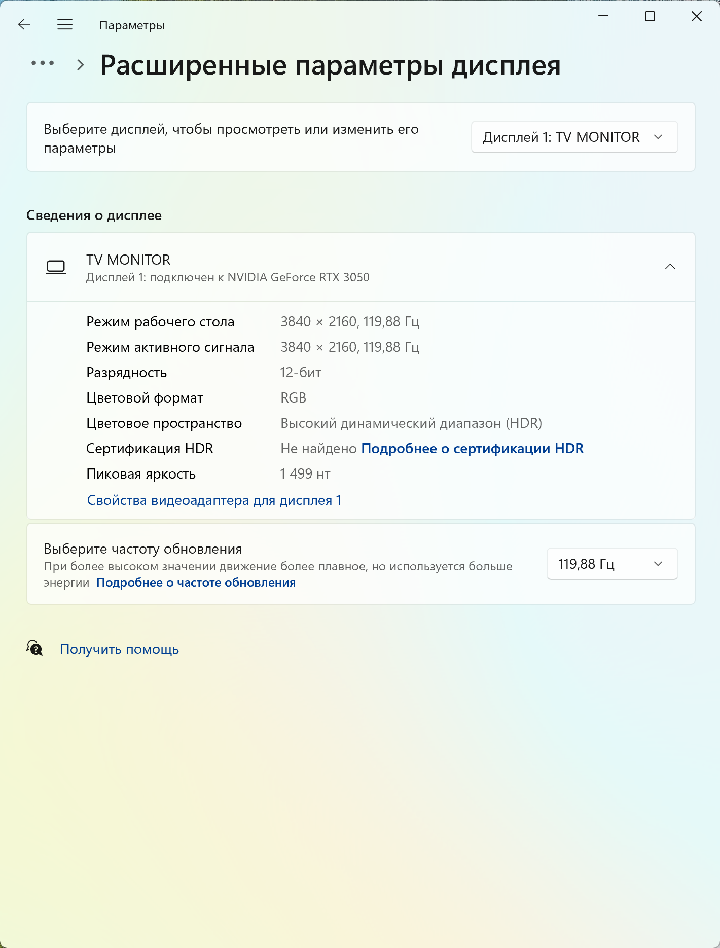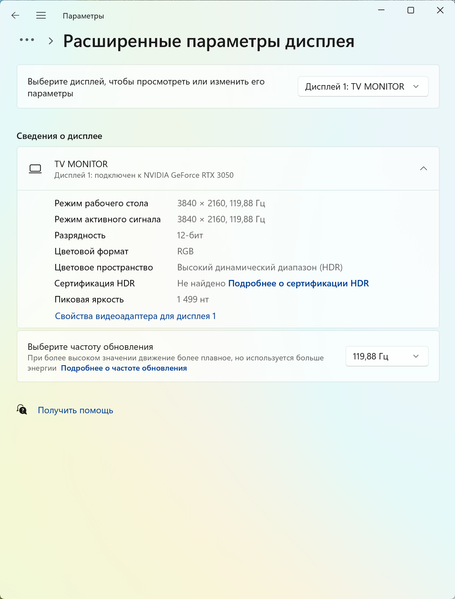 Стоит отметить, что исходя из данных, отмеченных в разделе «Сведения о дисплее», а также специальной отметки в информационном блоке утилиты VESA DisplayHDR Test, телевизор передает на ПК искаженные данные по своим возможностям — 1499 нит в пике и 799 нит в среднем при полном заполнении экрана. Это, безусловно, далекие от реальных значений цифры.
