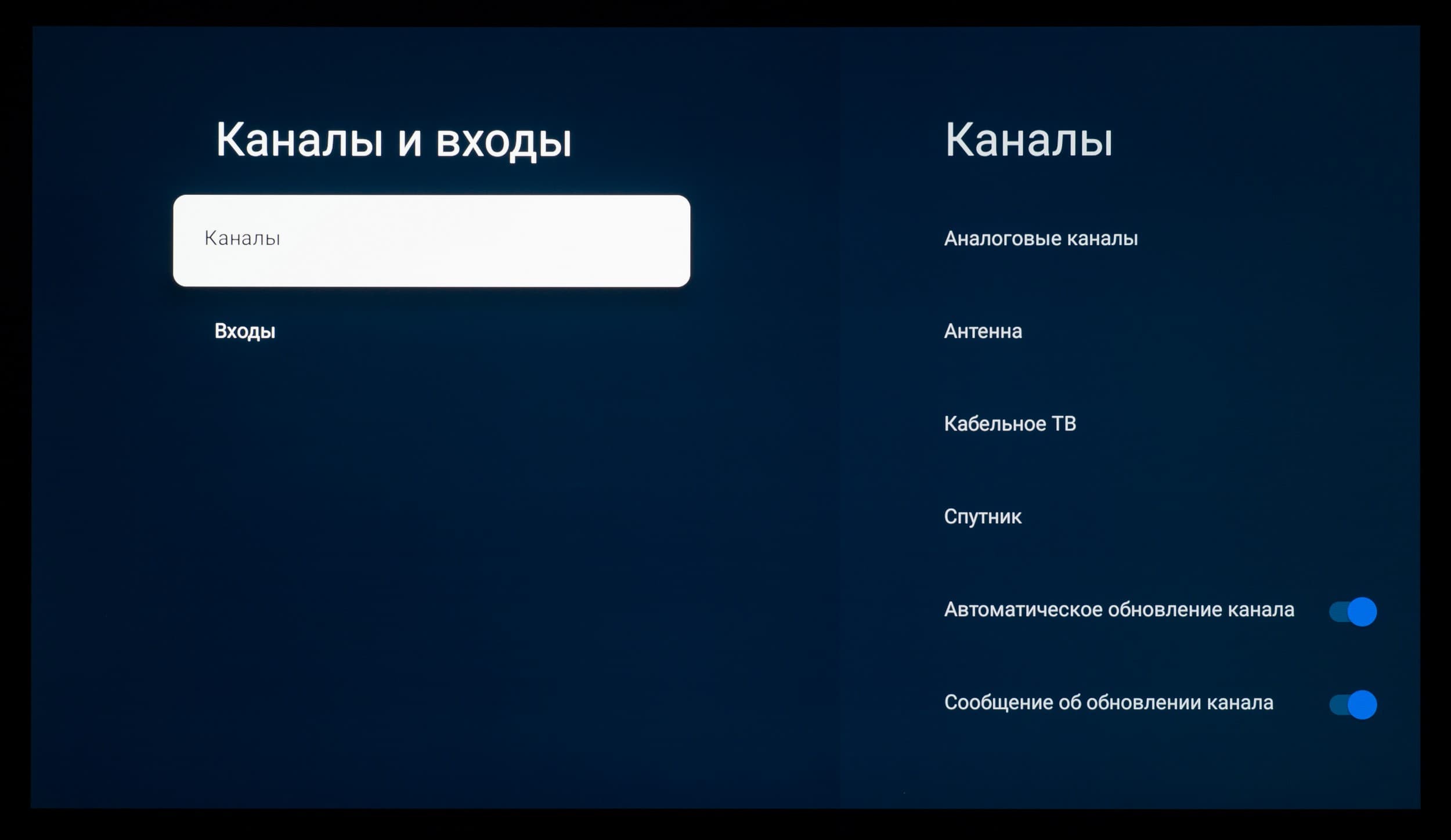 Основной же блок настроек выполнен в темно-синей цветовой гамме. Настроек, в частности настроек изображения и звука, много. Они доступны, например, из меню настроек, вызываемого с домашней страницы, либо из контекстного меню, которое можно вывести на экран при просмотре ТВ-каналов или внешних источников видеосигнала (ПК в их числе).