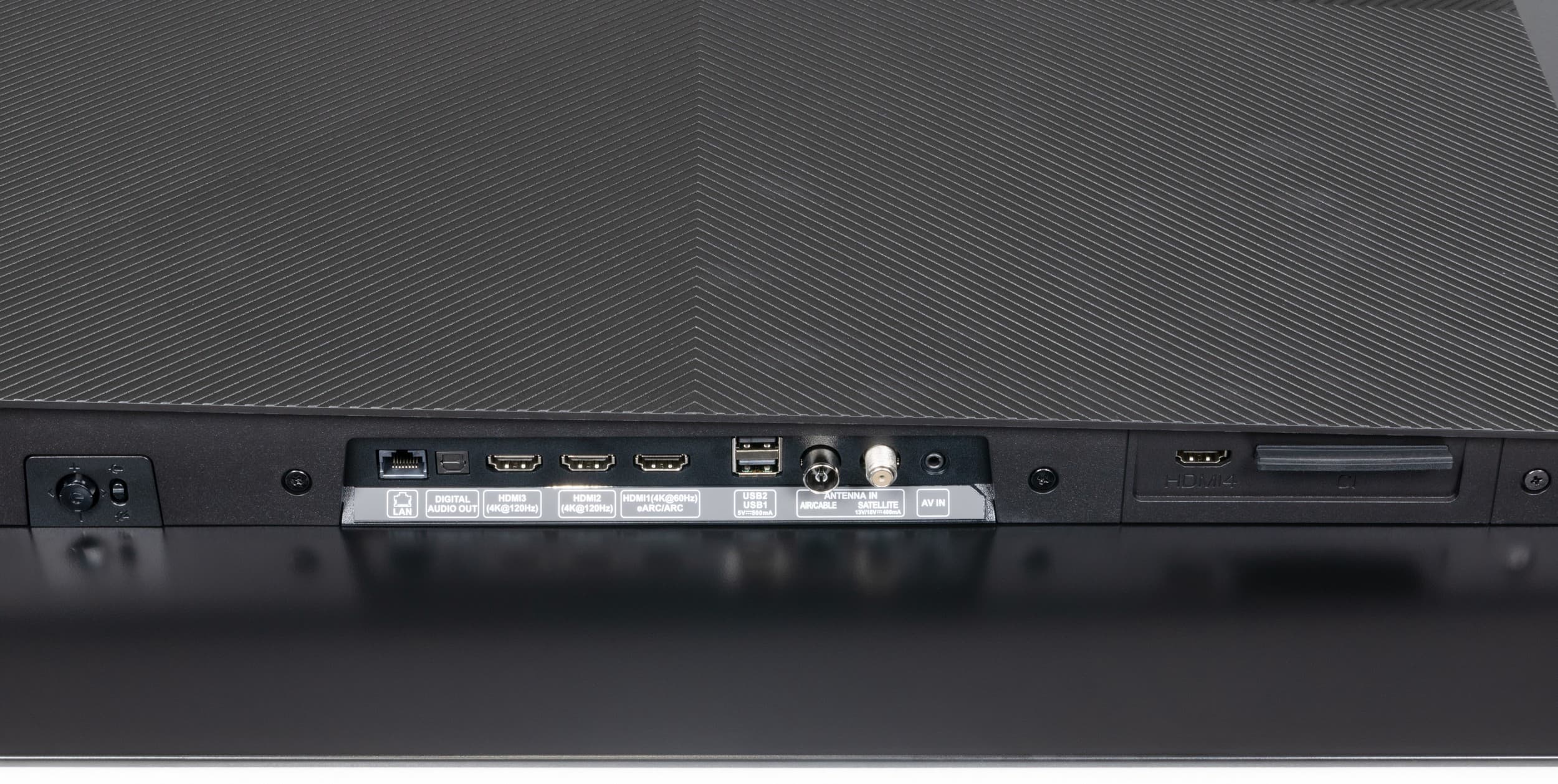 В плюсы телевизора стоит записать 4 входа HDMI (по заявлению производителя — два HDMI 2.0 с поддержкой 4K 60 Гц c eARC/ARC, а также два HDMI 2.1 с возможностью ввода сигнала 4K 120 Гц) и два USB 2.0 с максимальным током до 0,5 А, что обеспечивает беспроблемность работы большинства не слишком требовательных к питанию флэш-накопителей и твердотельных дисков (SSD). Также оба порта можно использовать для подключения слаботочной периферии (клавиатуры, мышки, USB-ресиверы) с соответствующим требованием по питанию.