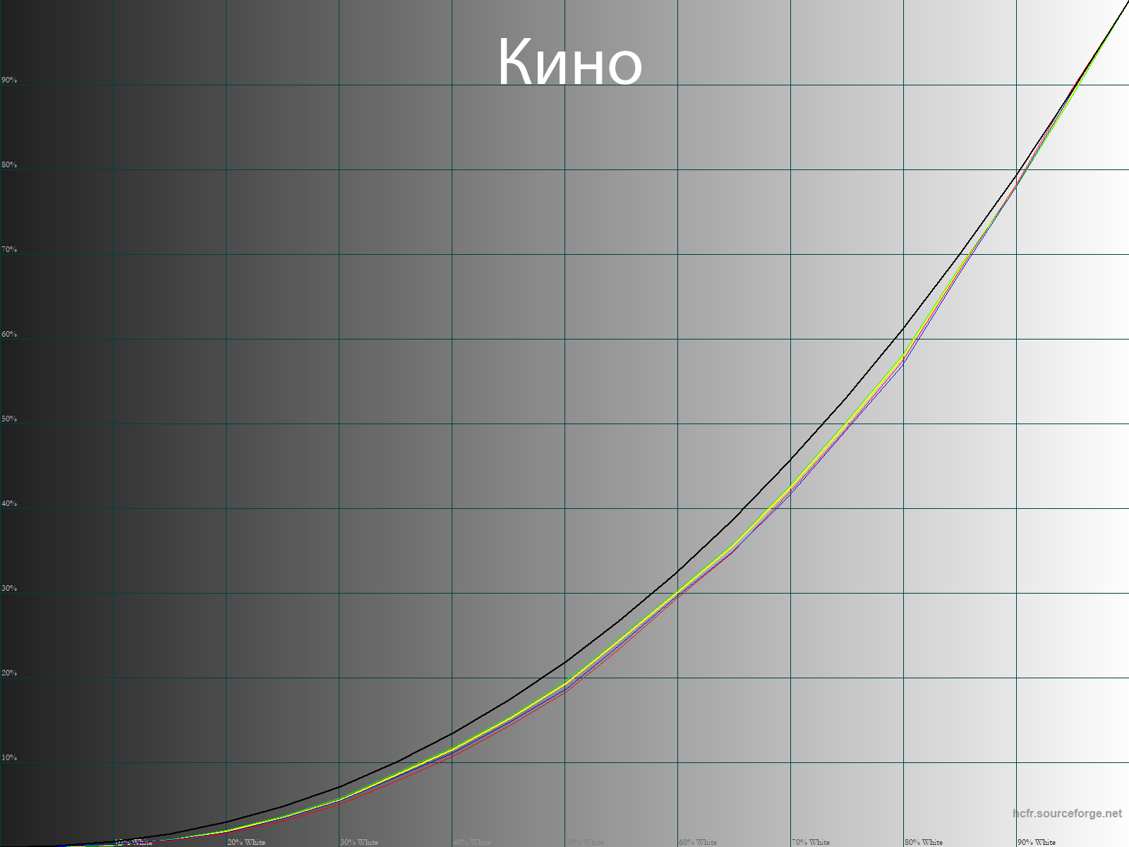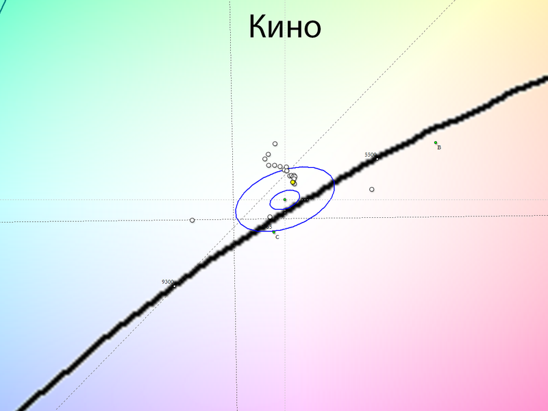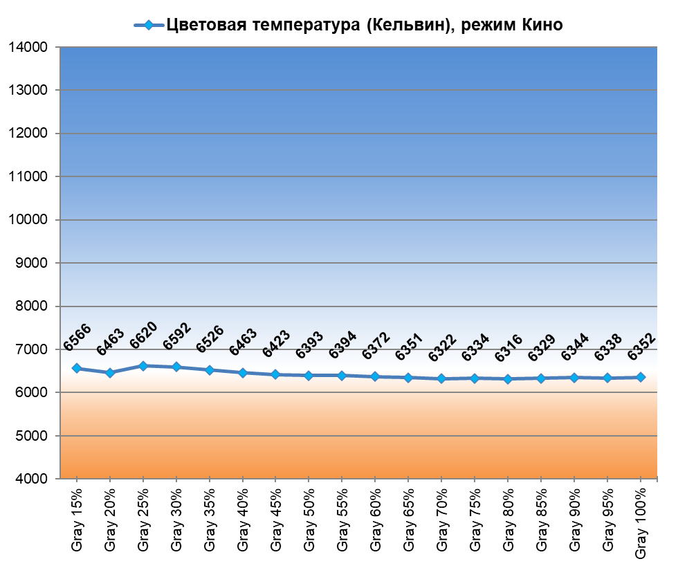 При переходе в предустановленный режим Кино результаты сильно меняются. Цветовая температура снижается до нейтральных 6350 К, баланс серых полутонов улучшается, но на части из них проявляется зеленый паразитный оттенок.