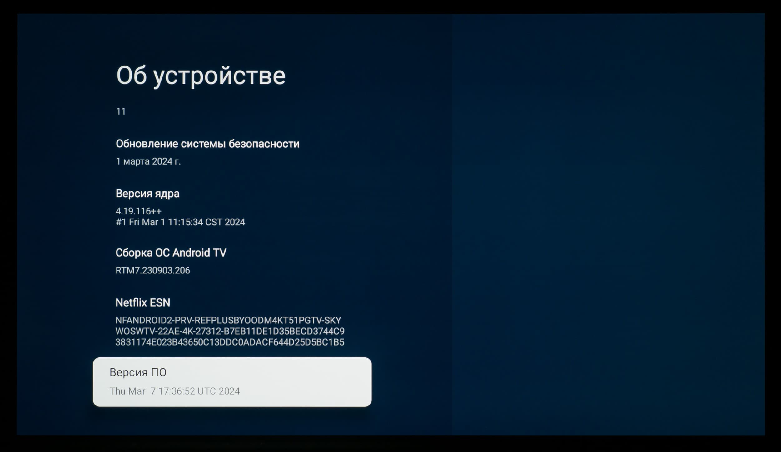 Рассматриваемый телевизор Digma Pro OLED 55M работает под управлением платформы Google TV, в данном случае основанной на Android версии 11 (она же обозначается производителем как Android R — Red Velvet Cake) с последним обновлением от марта 2024 года.