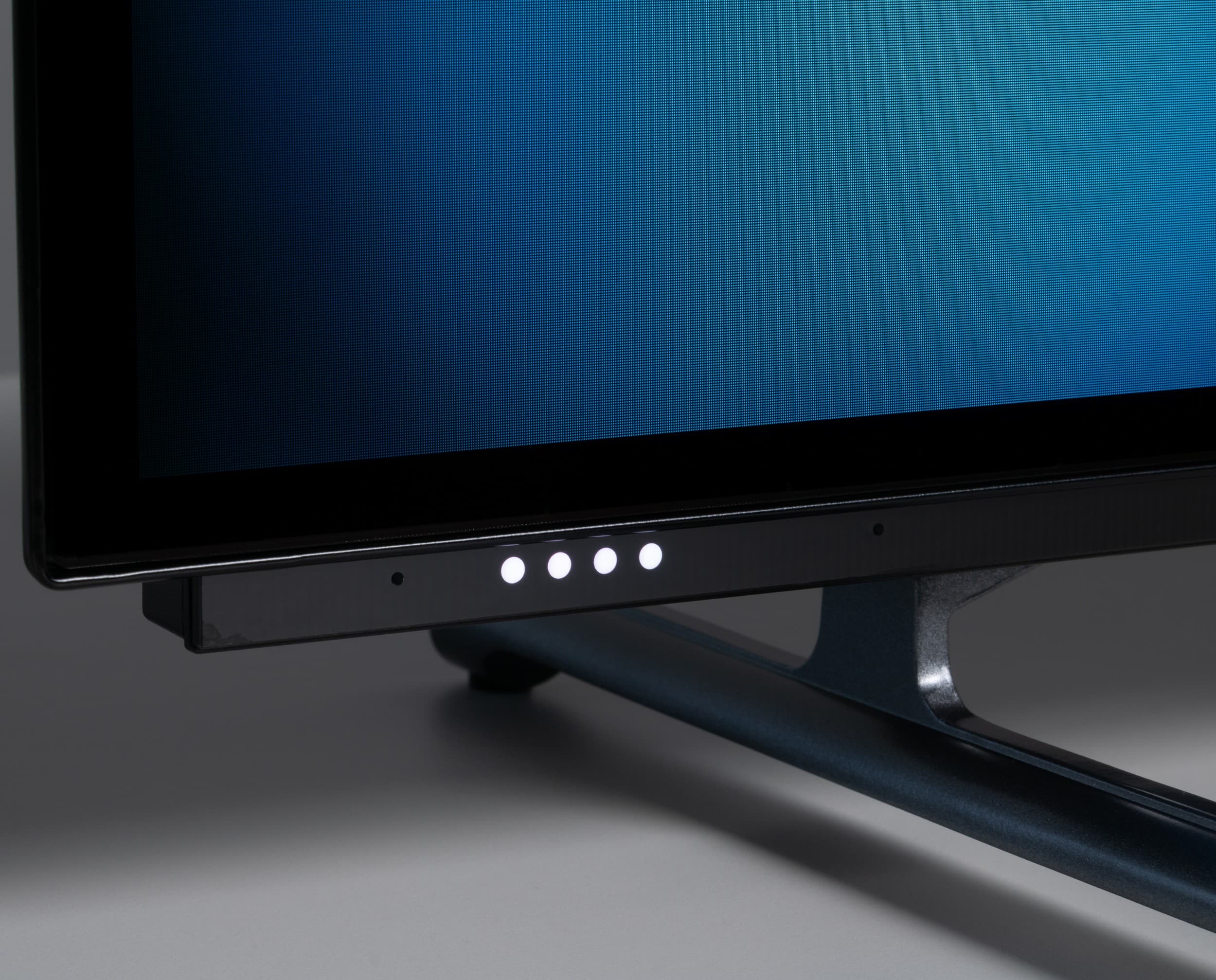 На нижней грани расположился внешний узкий блок, в который производитель интегрировал мерцающую RGB-подсветку (работает только в режиме Standby и при загрузке ОС), микрофоны системы постоянного голосового управления Far field и четыре крупных индикатора с белым (оранжевым в случае принудительного выключения системы) свечением, активируемых при обращении к Google-ассистенту. Здесь же рядом находится блок приема ИК-сигнала, в большей степени необходимый для включения телевизора. Впоследствии пульт управления переходит на Bluetooth-соединение.