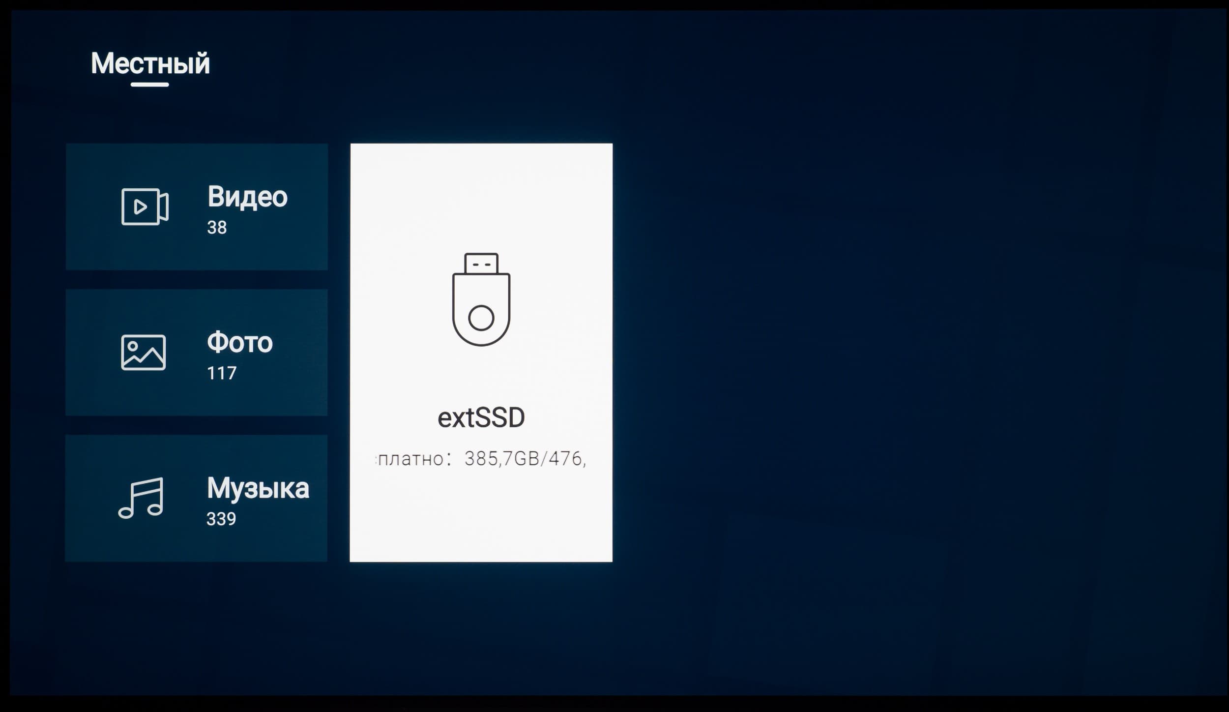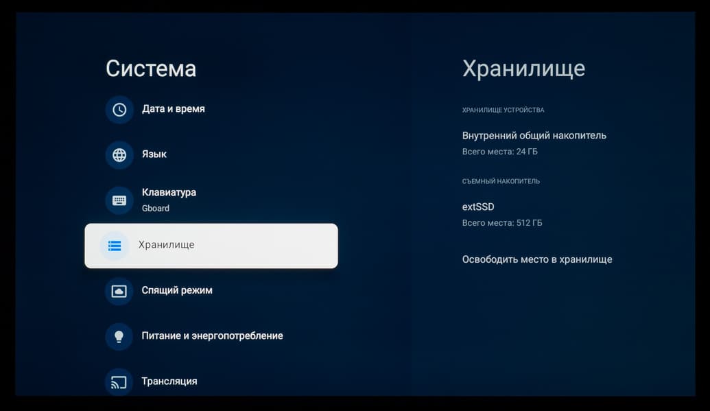 При подключении внешнего накопителя система уведомляет о его обнаружении и предлагает перейти в медиаменеджер. При переходе к этому уведомлению (в том числе и через отдельный блок со всеми собранными системой уведомлениями) вы можете открыть доступ к новому диску через встроенный проводник (с крайне ограниченной функциональностью), воспользоваться диском для записи ТВ-трансляций через функцию PVR, провести его форматирование средствами системы.