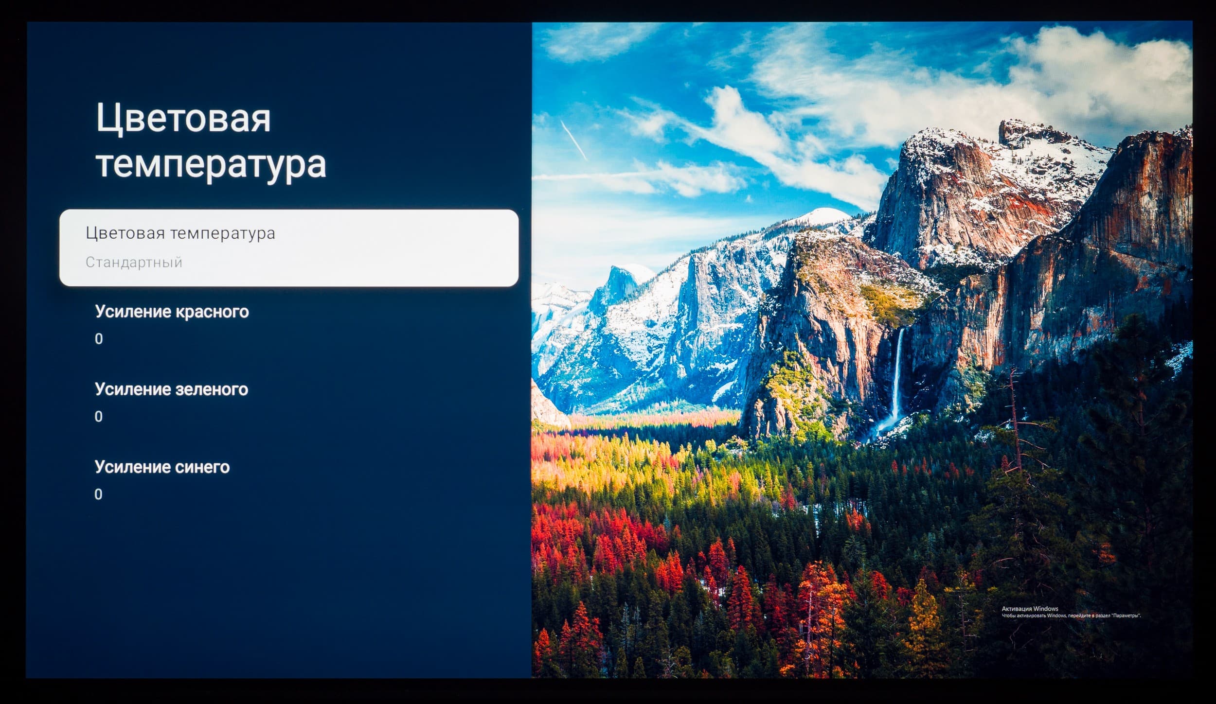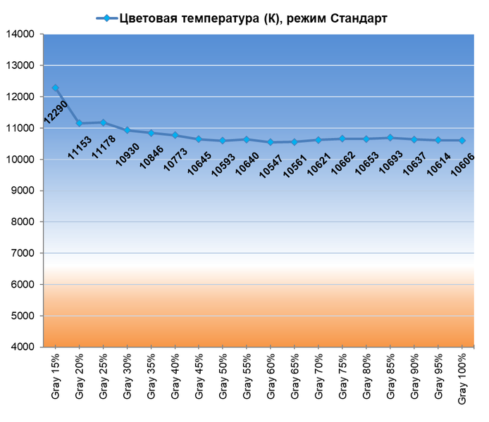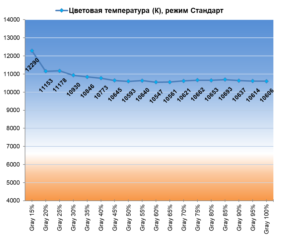 По настройкам цветовой температуры и баланса серого заводской режим Стандарт и режим эмуляции sRGB нас не сильно порадовали. Присутствует характерный для многих ТВ подобного класса уход в «холодный» — свыше 10000 К, но без паразитного оттенка. Баланс цветовой температуры оттенков серого при этом средний, и есть знакомый достаточно сильный уход температуры вверх на темных полутонах.