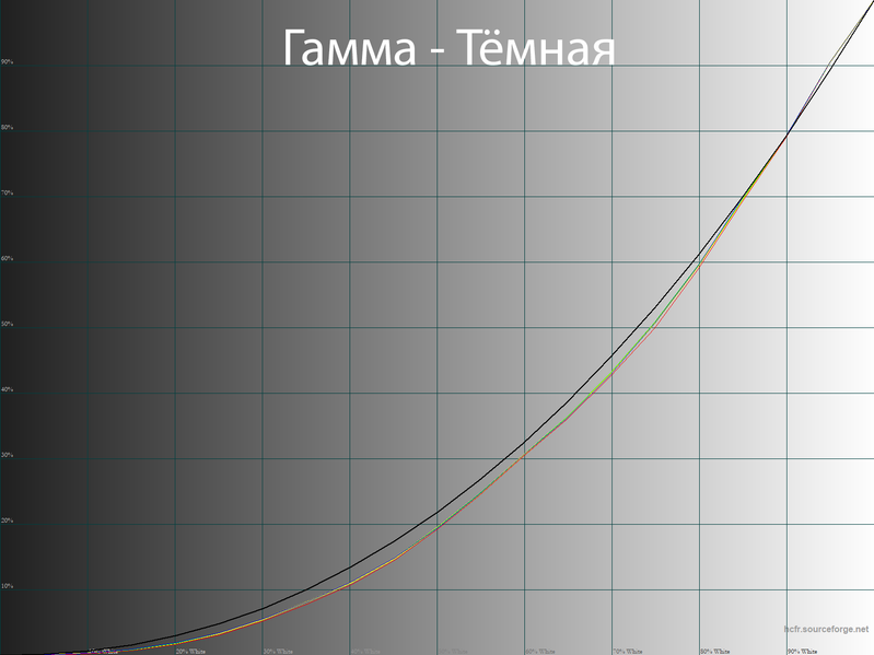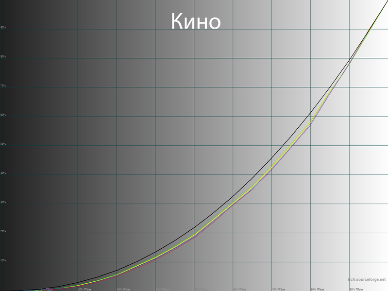 В специальном режиме Кино производитель постарался приблизиться к стандарту с кинотеатральной гаммой 2,4, но получилось еще сильнее — 2,45, а глубокие тени всё еще практически неразличимы.
