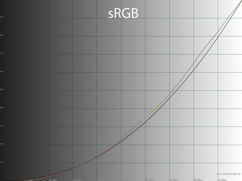 Гамма-кривые установлены на среднем уровне, как в режиме с заводскими установками, так и при активации эмуляции sRGB. Заметно понижена контрастность на средних полутонах, но зато нет выраженной различимости глубоких темных полутонов, что, в целом, свойственно большей части OLED-устройств.